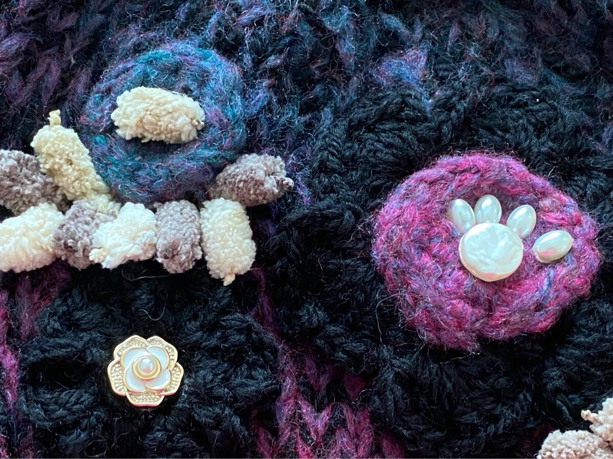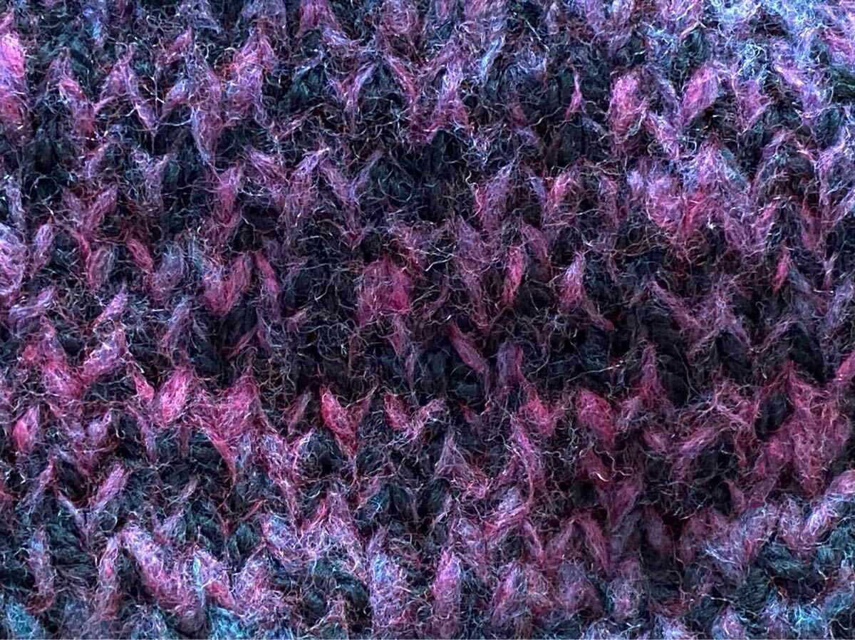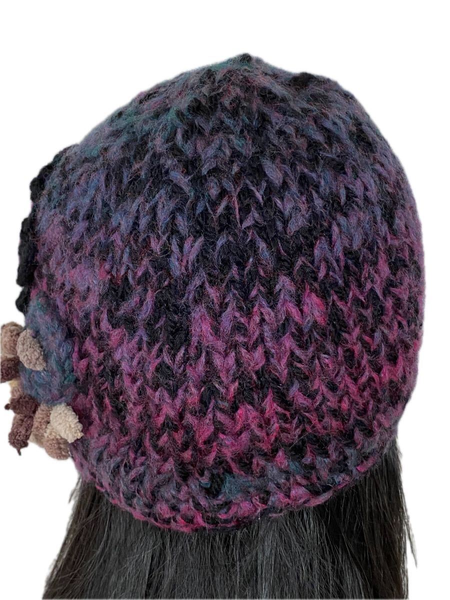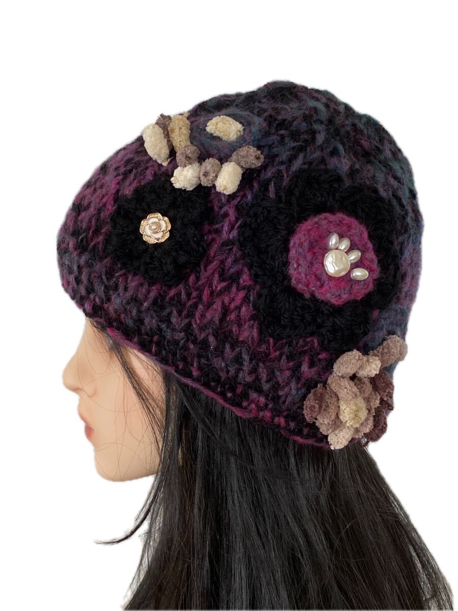 手作りの紫色グラデーションモヘア糸で編んだニット帽子になります。