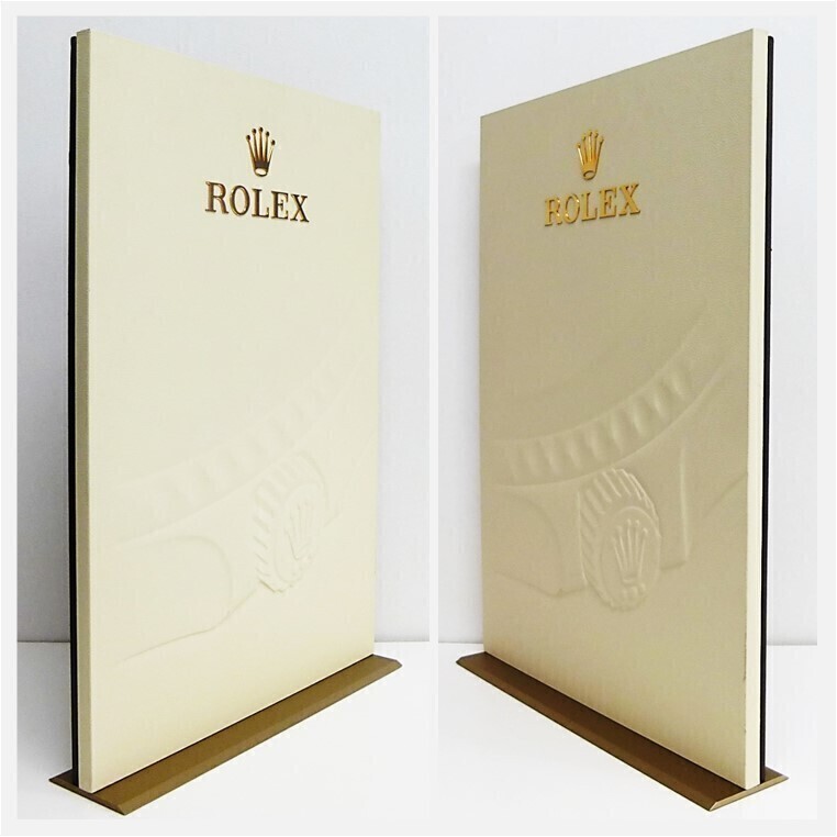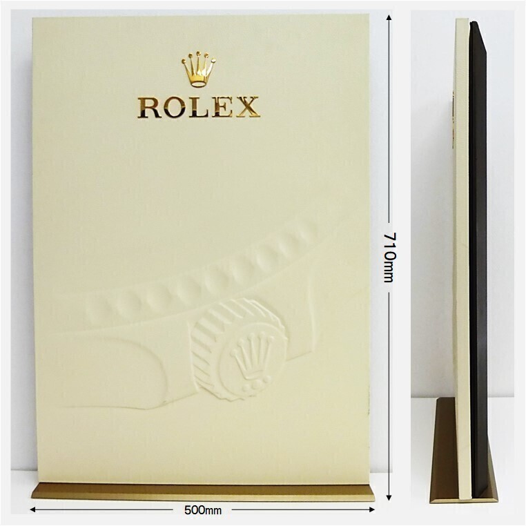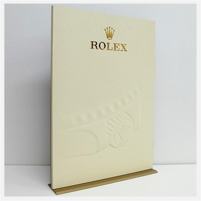 ◆表什器素材:木製のベースに、エンボスの高級レザーを貼り付けて、ロレックスロゴは金色銅を貼り付けています♪