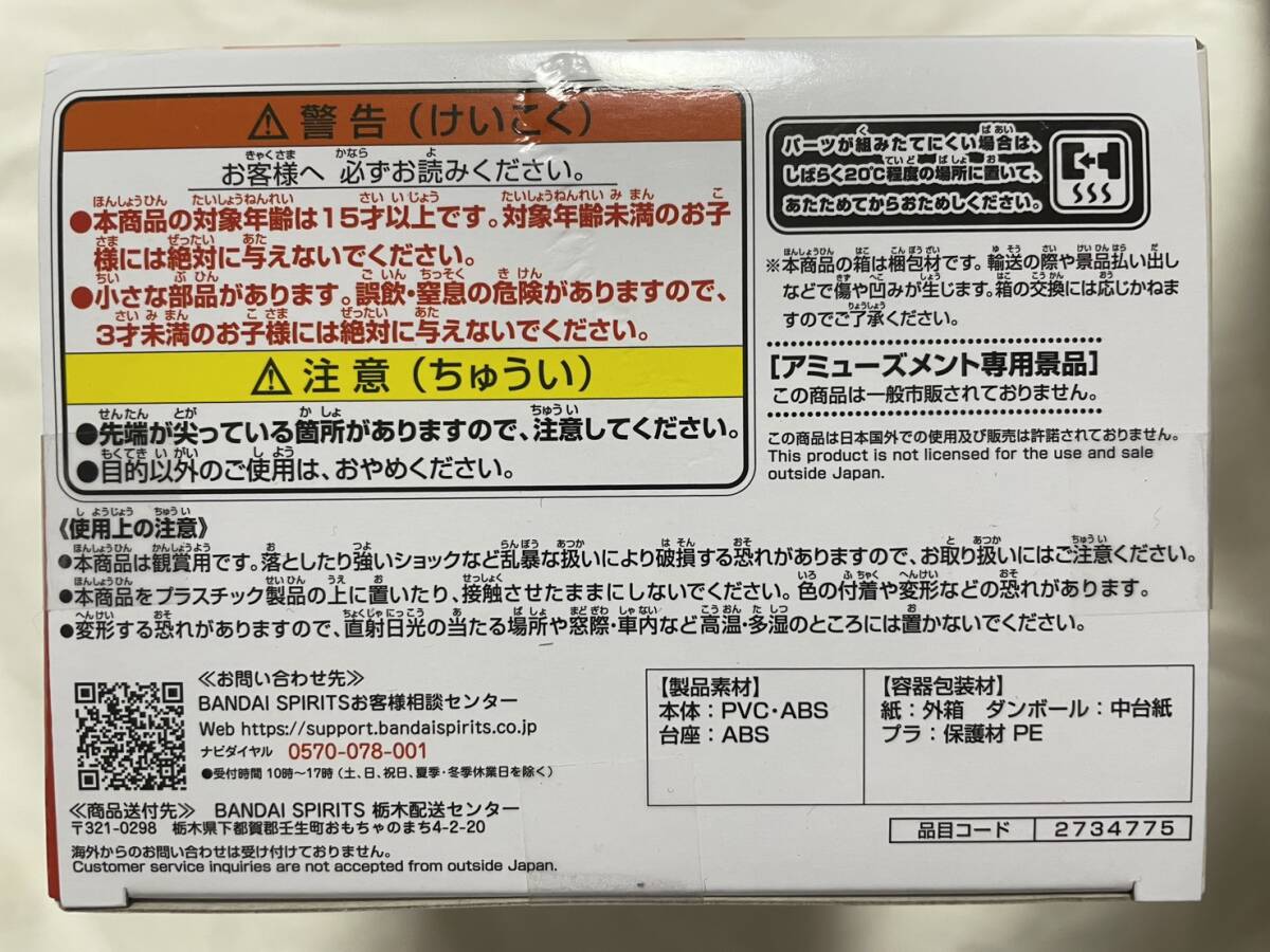 | 注意事項 | アミューズメント景品という性質上、クレーンのツメによる傷、 獲得の際の凹みなどがある場合がございます。 完璧を求めたり、未開封にこだわったり、外観を神経質に気にする方や箱から出さない様なコレクション、完品保管を目的とした方は、入札をご遠慮下さい。 新品未開封の為、中身の確認は出来ておりません。 商品の初期不良等は直接メーカーにお問い合わせ下さい。 ノークレームノーリターンでお願い致します。 入札の取り消しは受け付けておりませんので、よく考えてからご入札お願いします。 トラブル防止のため悪い評価の多い方の入札を取り消す場合が有りますのでご了承ください。 新規の方は入札の意思を質問欄よりお願い致します。 記載以外の発送方法以外をご希望の場合はご入札前に質問欄よりご連絡の上、当方対応の可否をご確認ください。 その他事項に関するご希望についてもご入札前に質問欄よりご連絡、ご確認をお願い致します。 また、オークション終了間近の場合、質問の回答が間に合わない場合が御座います。ご質問は遅くともオークション終了前日までにお願い致します。 仕事の関係上、御入金を確認後に商品を発送するまでに3日から4日程お時間を頂く場合もございます。 可能な限り、迅速な取引が出来るよう努めて参りますので、よろしくお願い致します。 |