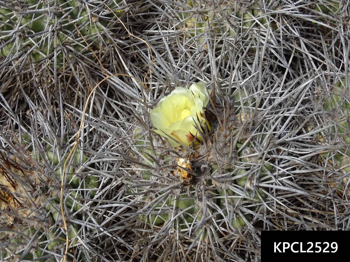 特徴・・・非常に長く湾曲した中央の刺をもちます。花色はピンクがかった黄色です