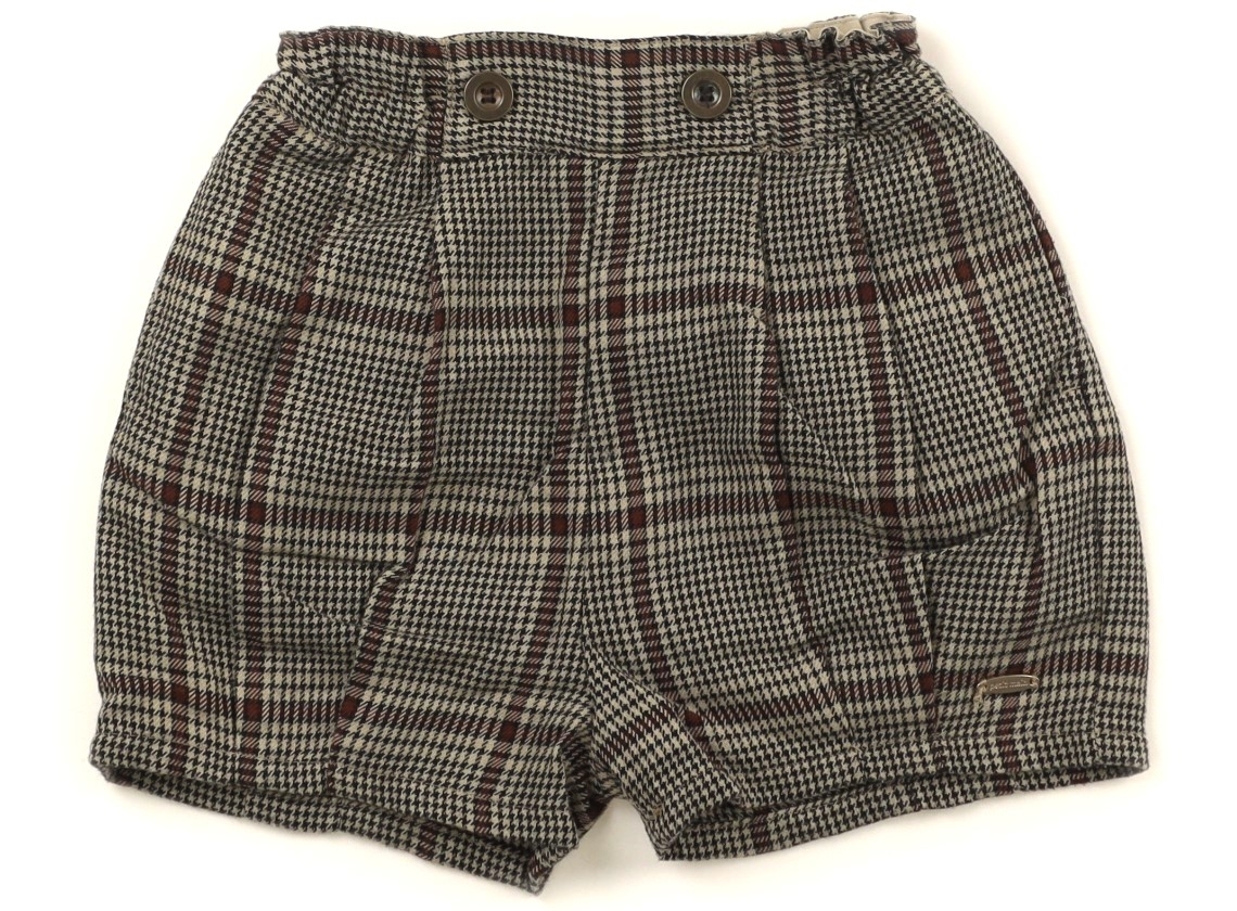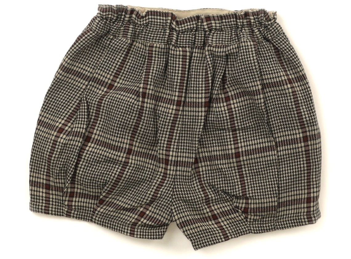 ポリエステル・レーヨン素材。裏地付き。ウエストは半分ゴムです。ブランドチャームの留め糸が緩んでいます。やや毛羽立ちがあります。