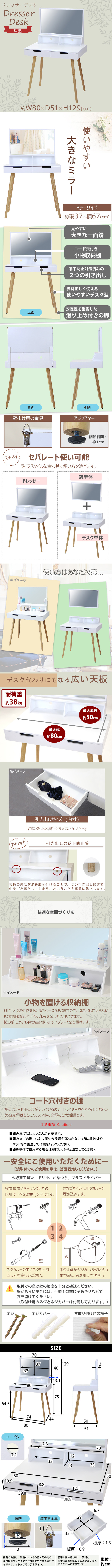 | 商品名 | 送料無料 ドレッサー MDF 約W80×約D51×約H129(cm) 鏡台 ドレッシングテーブル ドレッサーデスク 白 ミラー 1面鏡 引き出し 収納 組立品 化粧品 コスメ テーブル 机 デスク コード穴 ホワイト dresserlt067awh |