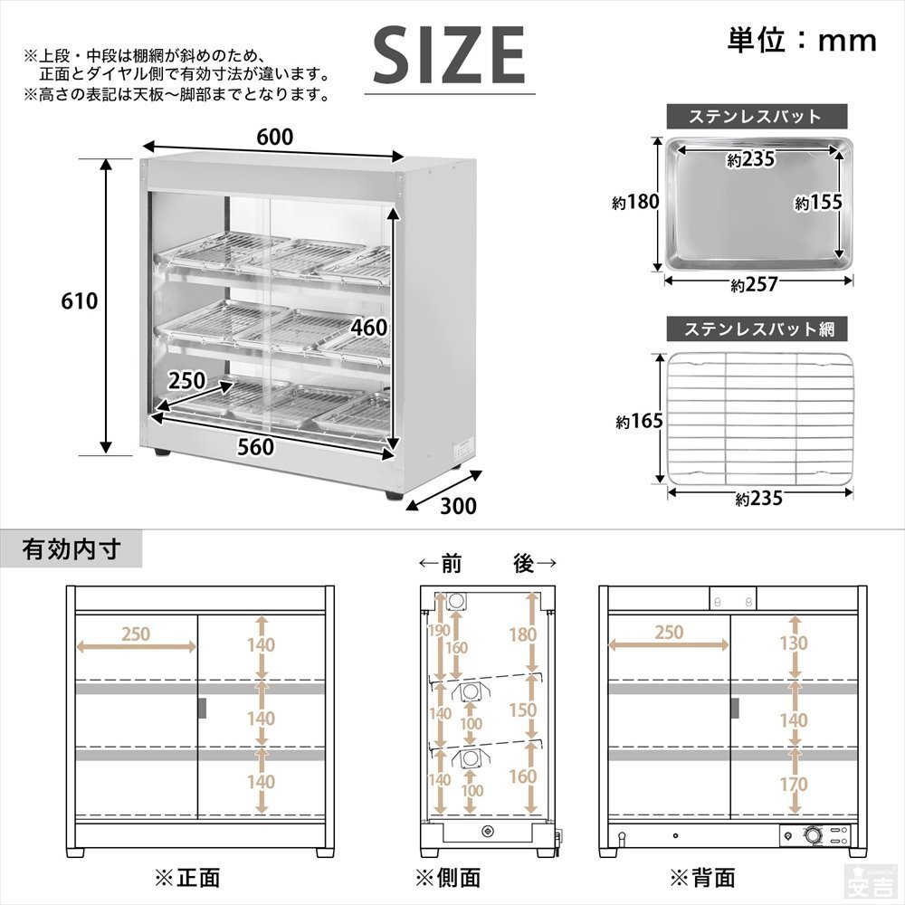 | 説明 | 卓上タイプ 【電 源】単相100V 50/60Hz 【消費電力】470W 【重 量】約21kg 【材 質】SUS430 厚み0.7mm 【温度帯】30℃~85℃ 可変サーモ付 【扉開閉方式】両面スライド式強化ガラス 【付 属 品】スノコ・ステンレスバット (網付9枚(約幅180×奥行257×高さ17mm) ・ラベルシールセット・シャンデリア球(40W/E17)×3 トングホルダー×1 スライドガラス用取っ手×4 ※当社1年保証付 保証期間外でも当社へご連絡頂ければ修理・メンテナンス等、迅速に対応させていただきますのでお気軽に当社へご相談下さい。 ※電源コードを束ねて使用しないでください。 ※屋内用 ※目盛りの温度は参考程度となります。 ※庫内温度は本体周辺の温度、風の有無、 ドアの開閉などに大きく影響を受けます。 各棚により温度は異なり、最下段が温度が高く、 上段へいくほど温度は低くなります。 ダイヤルでの設定温度に必ず安定する訳ではございません。 |