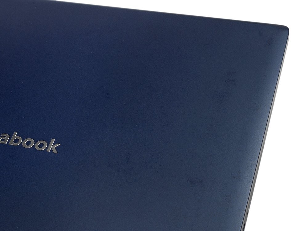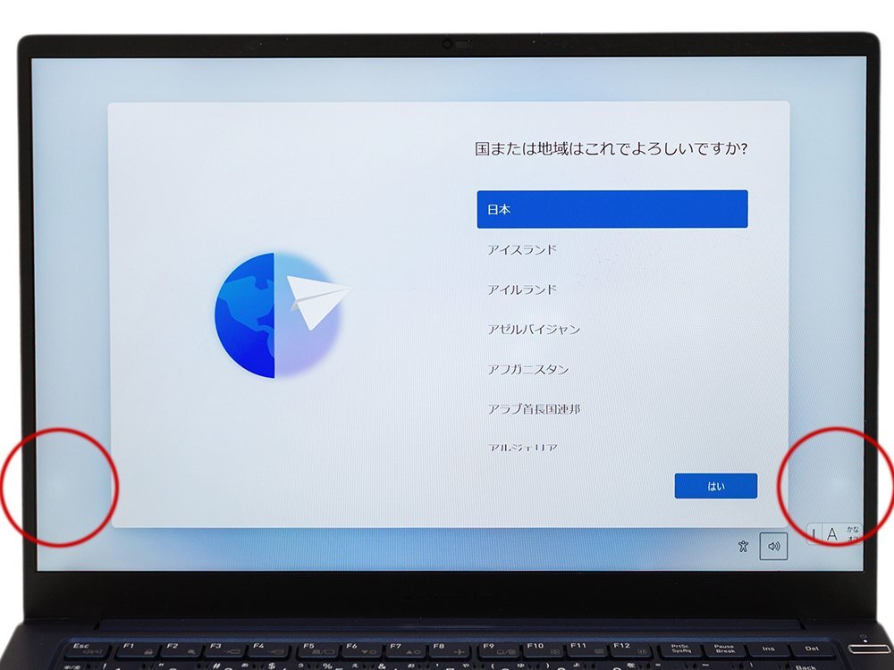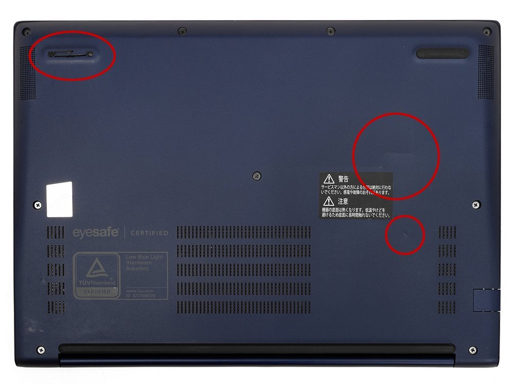 特に目に付く大きな傷や割れなどの破損は見当たりませんでしたが、モバイル機器としてハードに使われていた様で全体的に汚れや小キズ、スレなどの使用感があります。写真では飛んでしまって見えにくいですが、トップ面の各初期スレがあり黒ずみになっている箇所があります。また、軽量化のためボディが薄く特に底面は圧力がかかっておそらく下にある基盤の何かと当たったと思われる跡が凸凹になって現れています。加えて底のゴム足がひとつなくなっていました。ディスプレイに割れなどのダメージは見当たらず、ざっと目視した範囲でドット抜けは見当たりませんでしたが、写真で赤マルにしている左右2個所に液晶ムラがあります。加えて、恐らく運搬時の加圧によって画面の表面ににキートップなどが当たったと思われる小キズがあります。 |
