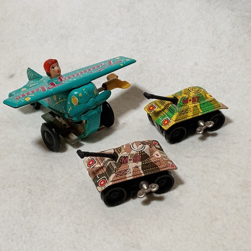 【昭和レトロ】ブリキ製 ゼンマイおもちゃ 3点セット/Training Plane・M-57 TANK 日本製 当時物