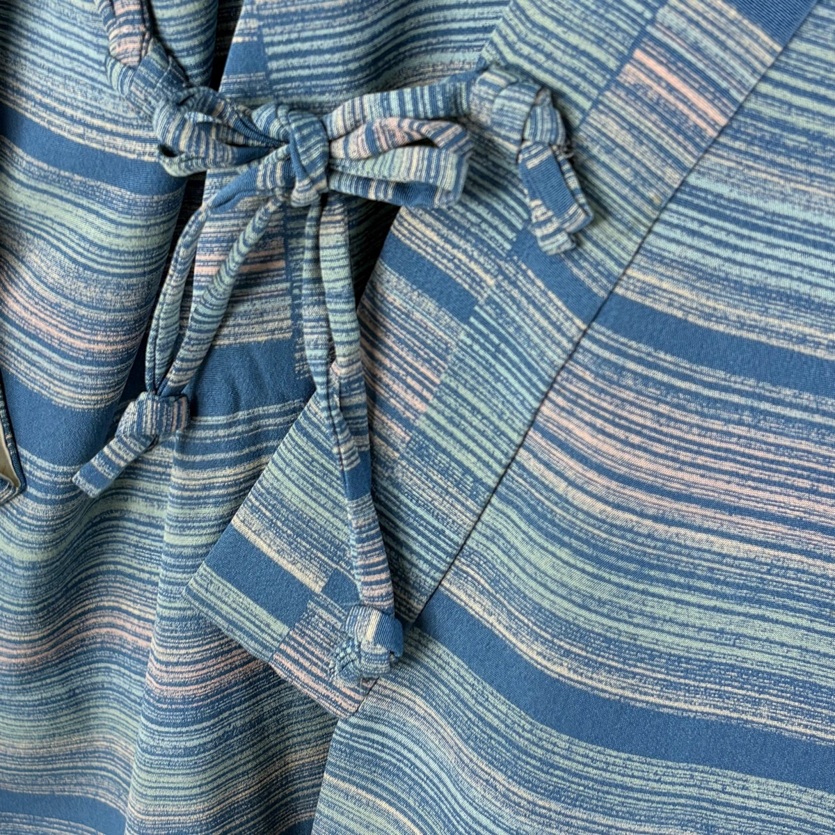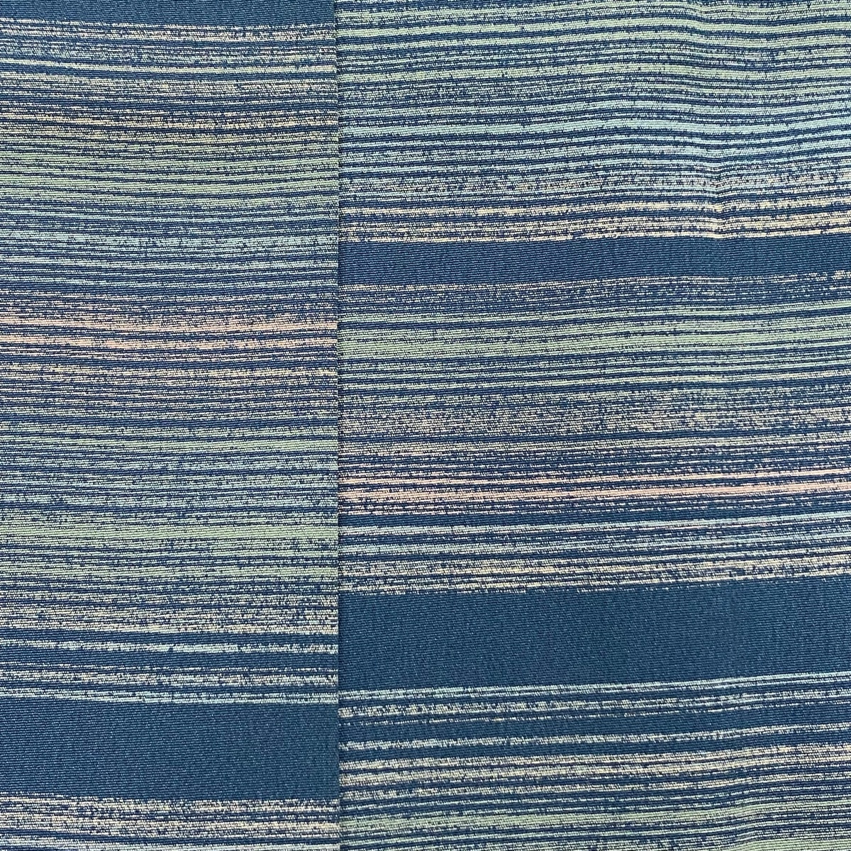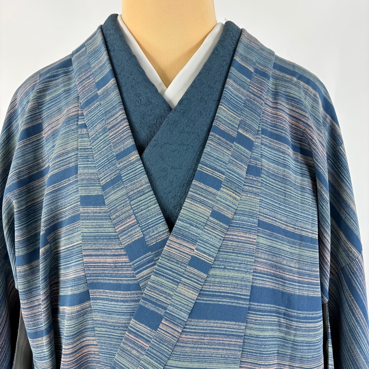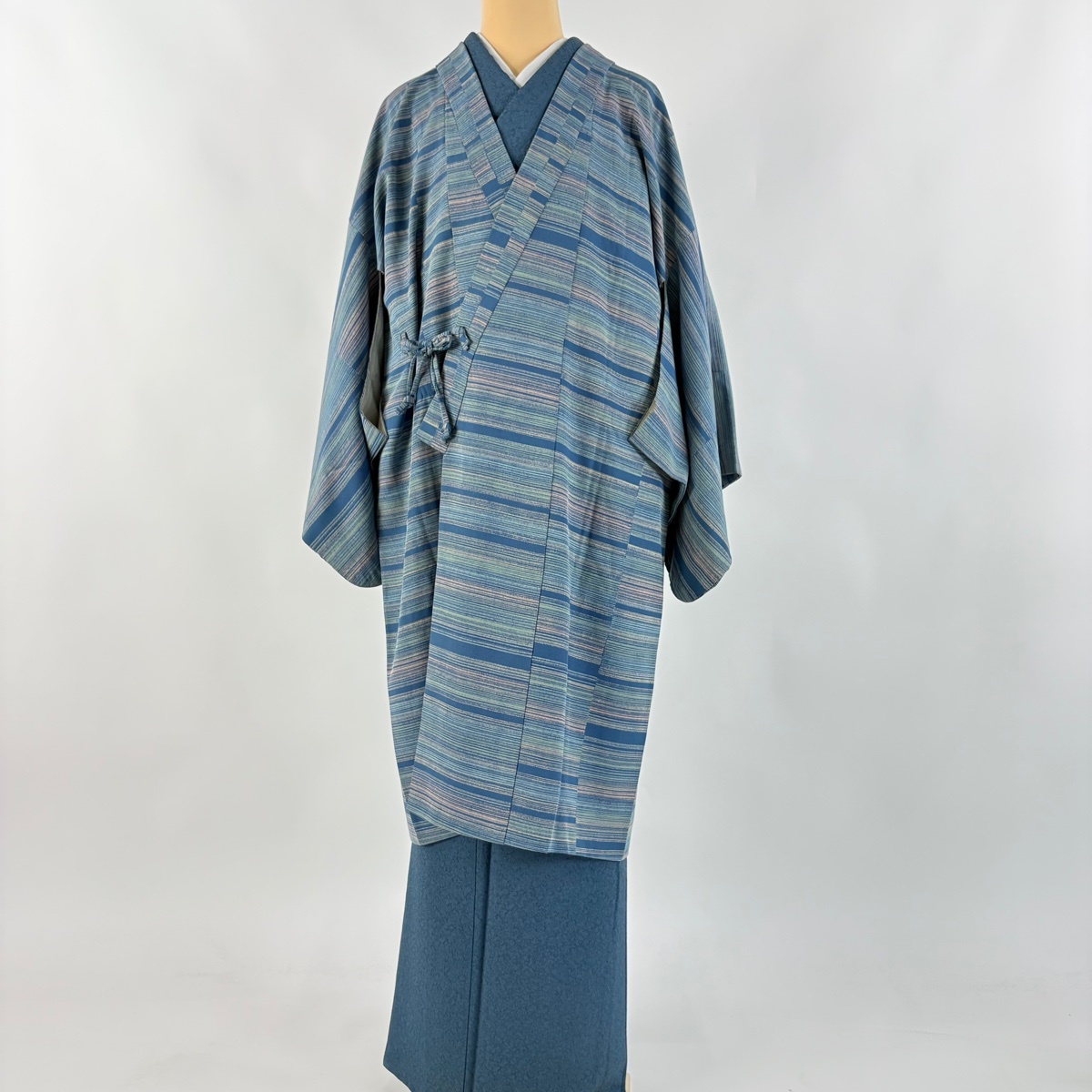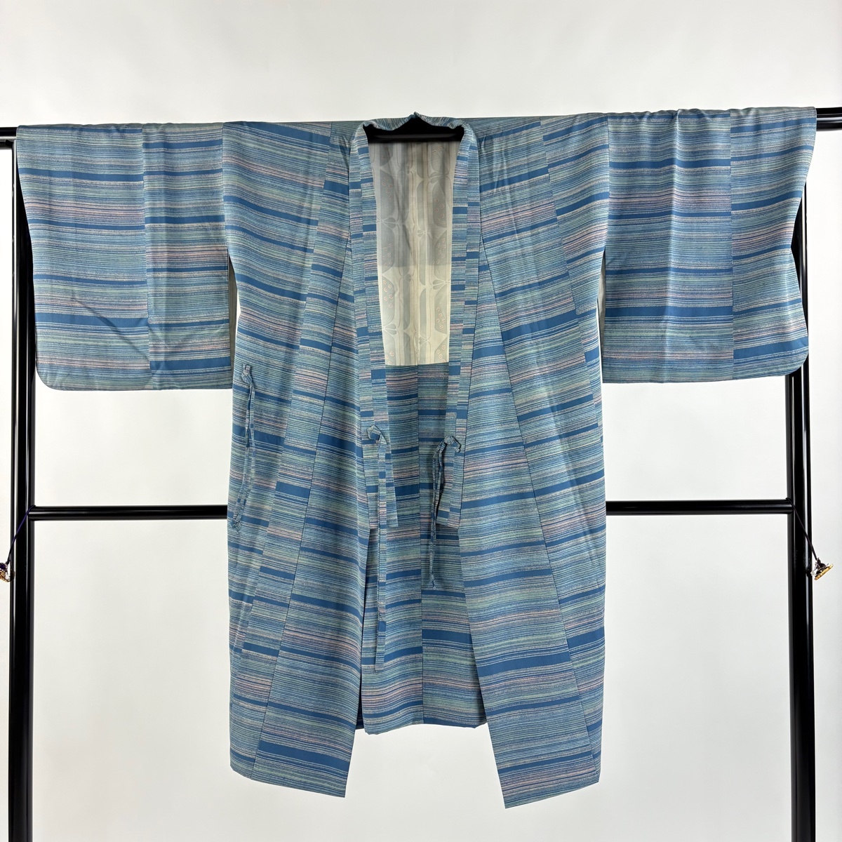 | 道中着 名品 和装コート 着物衿 横縞 青 身丈106.5 裄丈68 L 正絹 【中古】 |