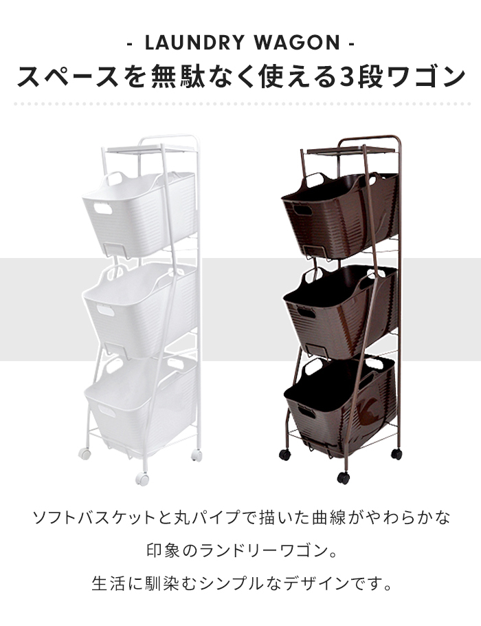| ソフトバスケットと丸パイプで描いた曲線がやわらかな印象のランドリーワゴン。 斜め置きのため、出し入れしやすく、扱いやすいデザインになっています。 天板には洗剤や洗面周りのちょっとした小物を置くことができ便利です。 キャスターがついているため、洗濯物の移動もスムーズに。 たっぷり入るバスケットは、丸洗いもできる優れもの。 |
