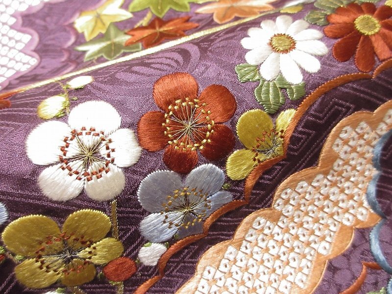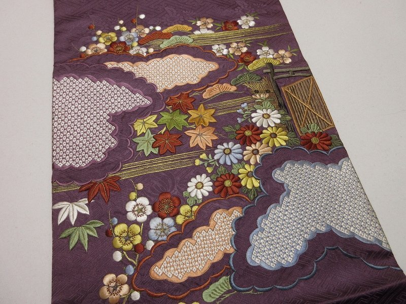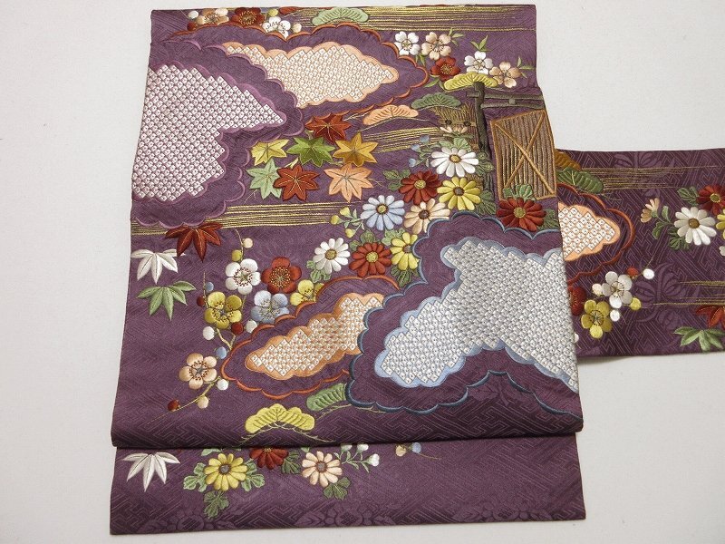 | 商品名 | ドークブア■九寸名古屋帯 アンティーク 手刺繍 雲取りに松竹梅 滅紫 極上の逸品 ★ D06 |
