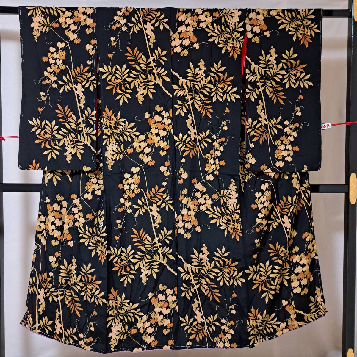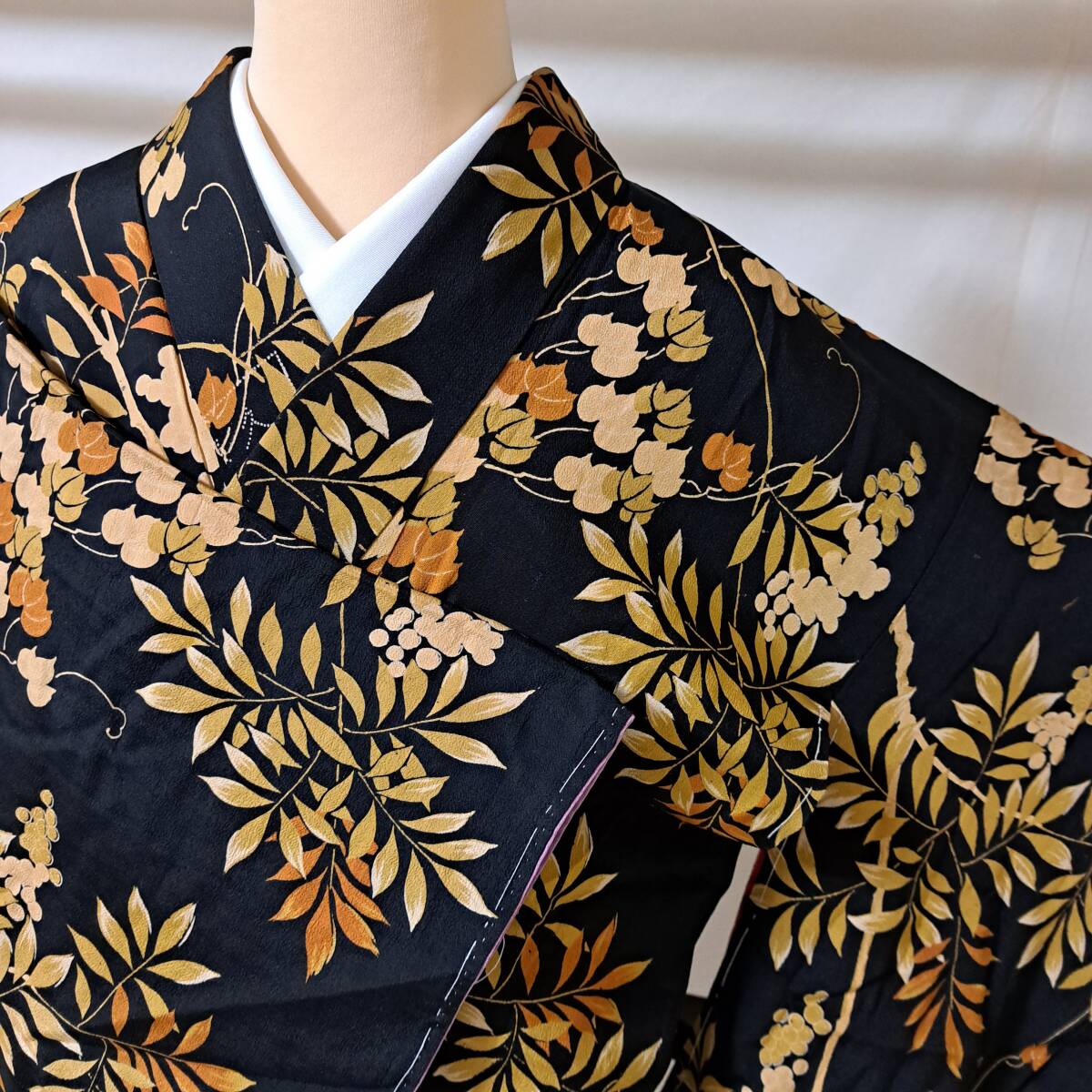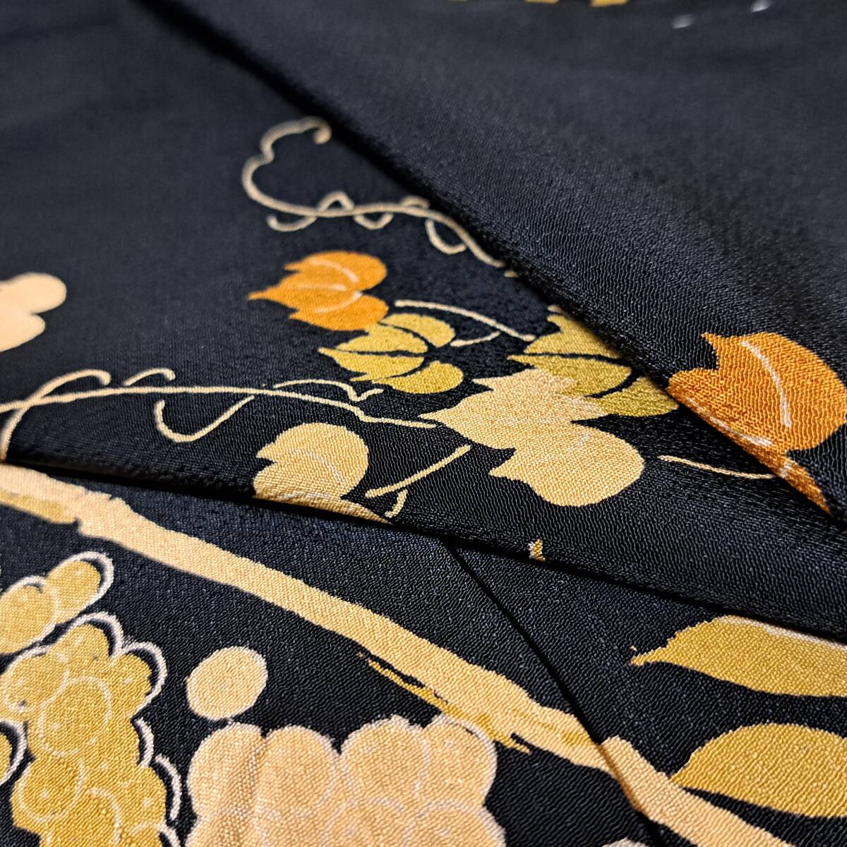 即決■着物の越田■裄62身丈140正絹 アンティーク着物 黒地 葡萄 ■も10R02
