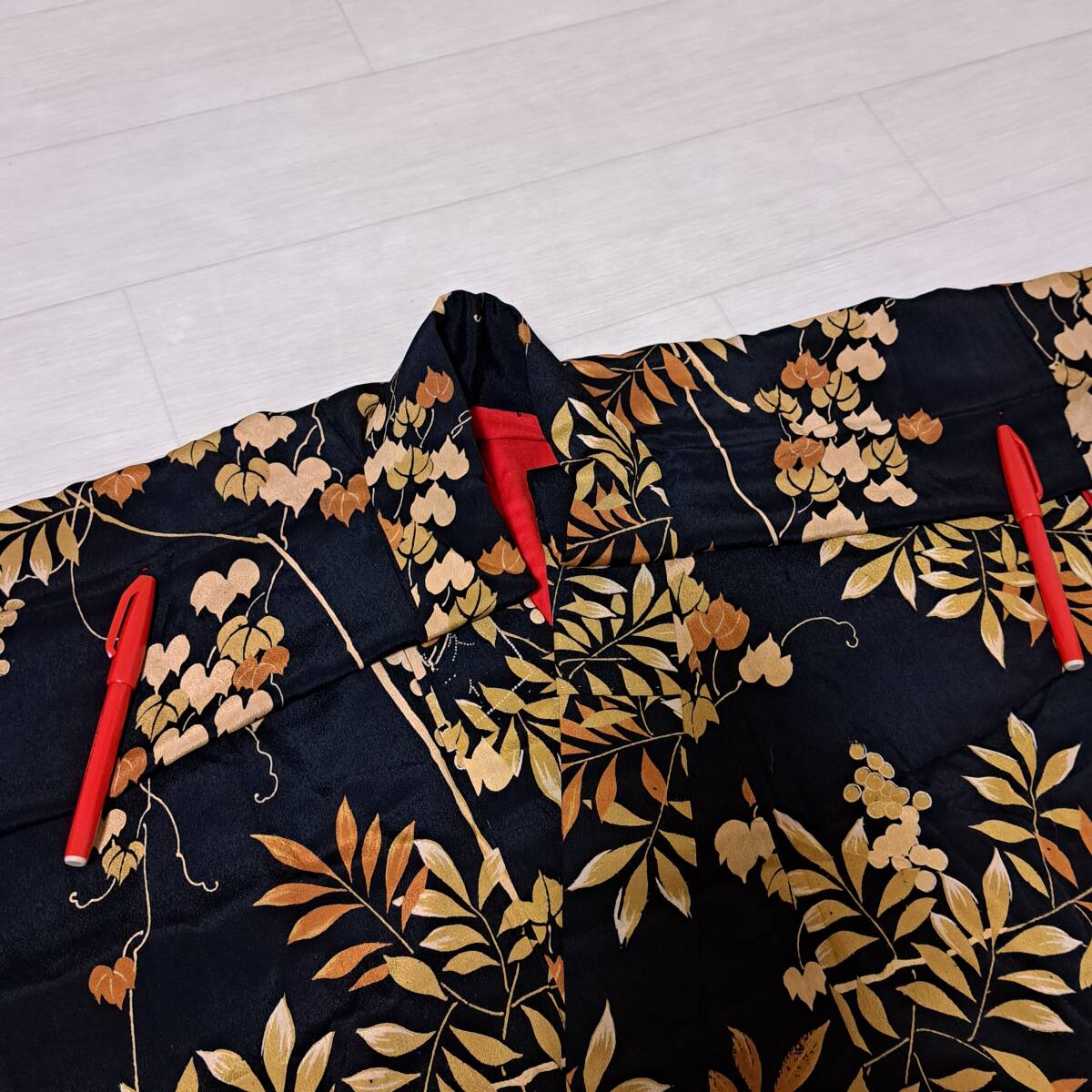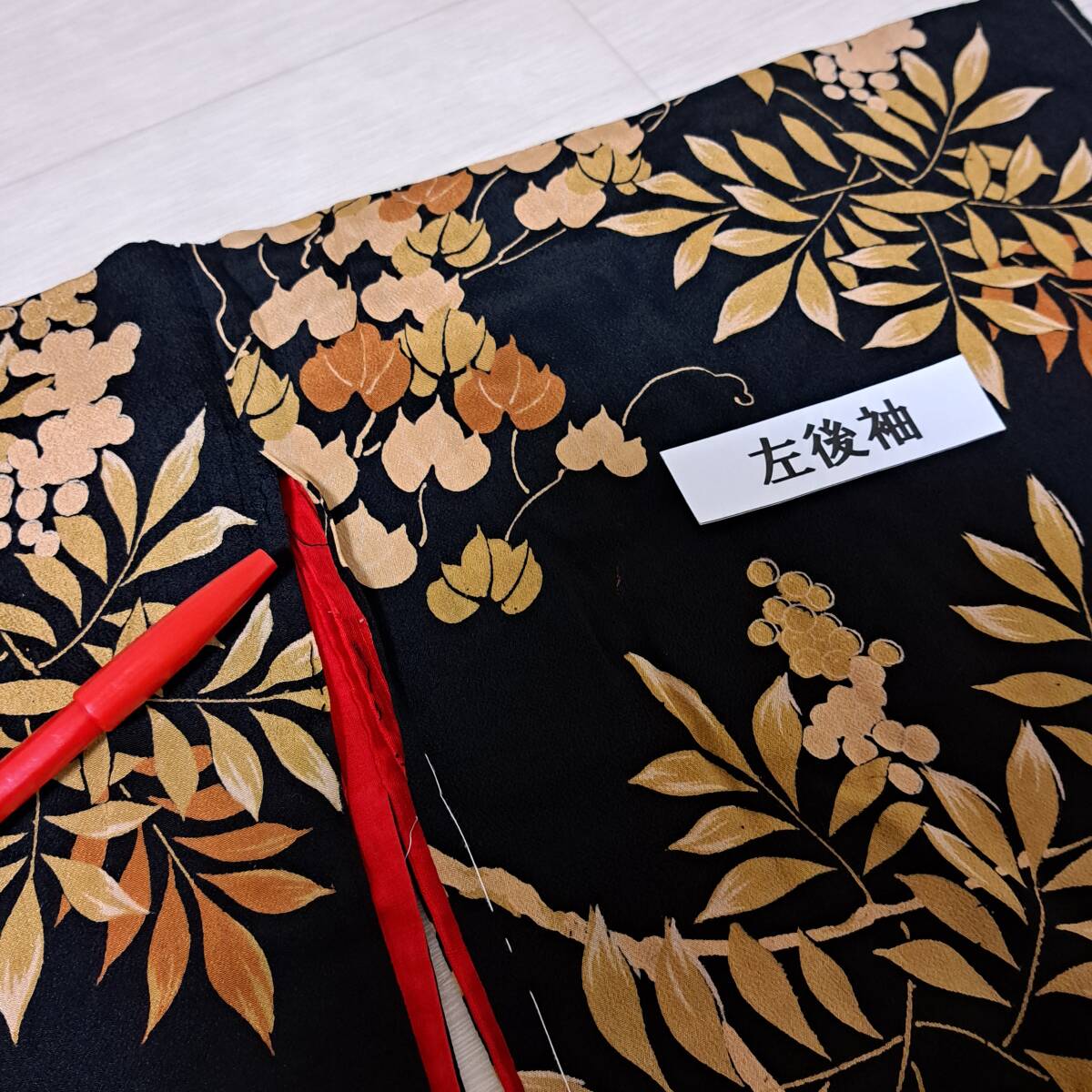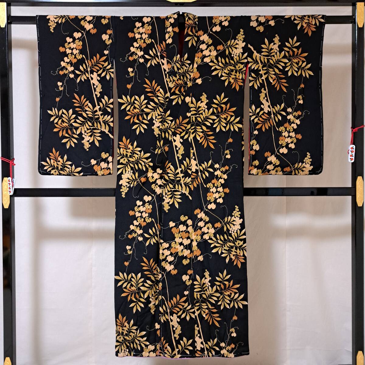 即決■着物の越田■裄62身丈140正絹 アンティーク着物 黒地 葡萄 ■も10R02