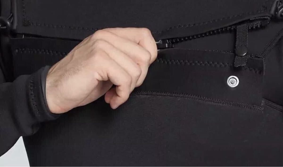 ●前開きファスナー(チェストジップ)のため着脱が便利、保温性、防水性アップに加え、バックジップタイプのようにジッパーによる背中の突っ張りがなくパドルがスムーズ。
