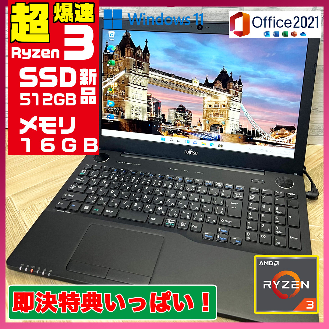 極上品/新型Window11搭載/富士通/爆速Ryzen 3搭載/カメラ/高速新品SSD512GB/驚異の16GBメモリ/DVD焼き/オフィス/ソフト多数