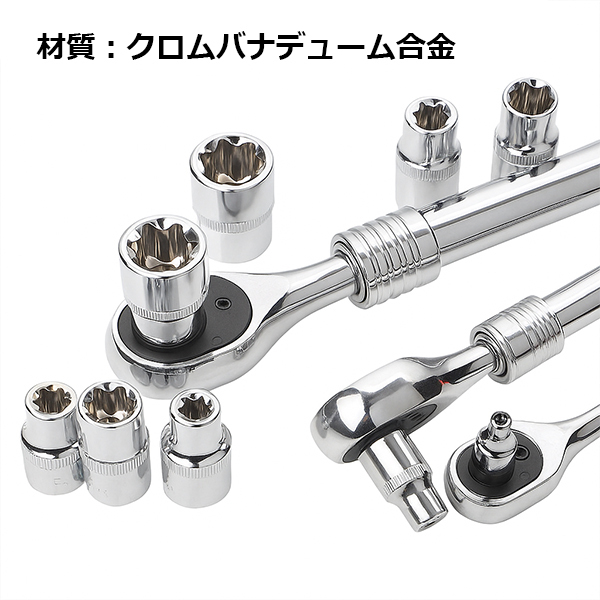 10個セットのE型ヘックスローブソケットセットです。 材質:クロムバナデューム合金 サイズ 1/4"(6.3mm) : E4、E5、E6、E7、E8 3/8"(9.5mm) : E10、E12、E14、E16、E18 |