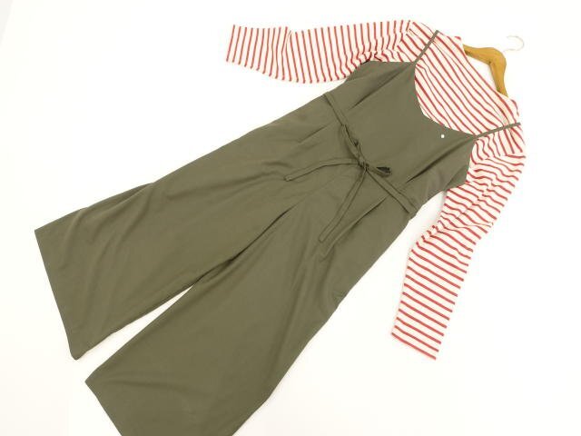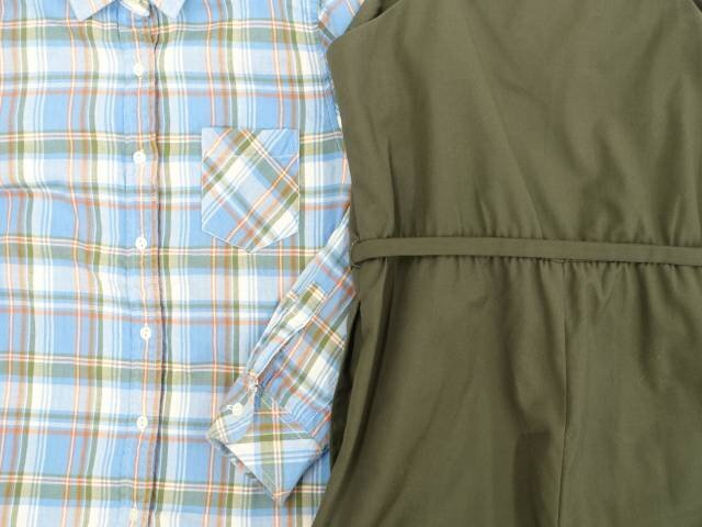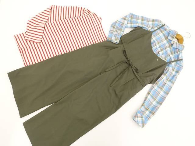 オールインワン+長袖シャツ+長袖カットソー コーディネート3点セット M相当 モスグリーン/ライトブルー×モスグリーン×ホワイト×オレンジ チェック柄/ベージュ×レッド ボーダー柄 カジュアル・ナチュラル系 20代・30代