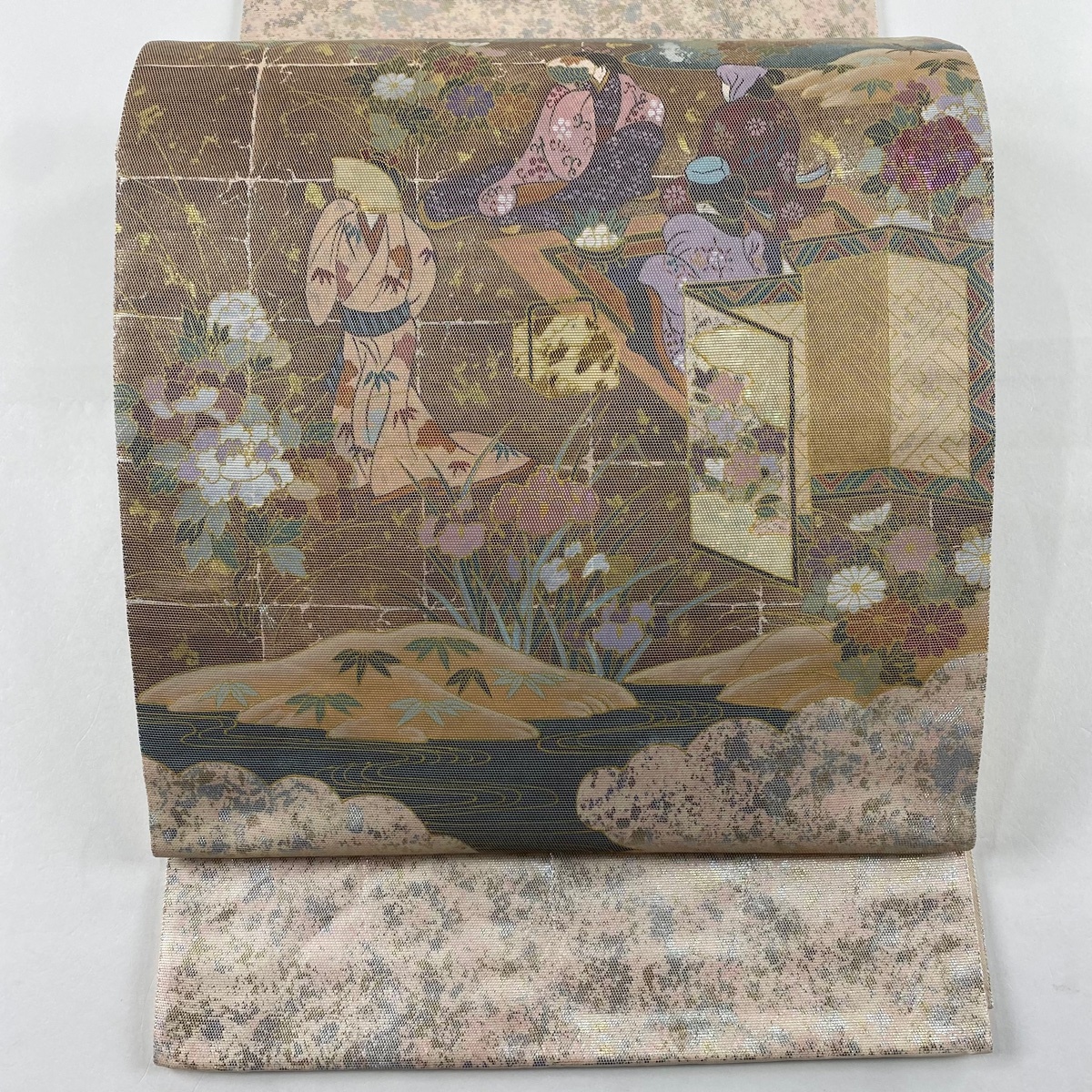 | 袋帯 秀品 関西仕立て 人物 草花 箔 薄小豆 お太鼓柄 正絹 【中古】 |