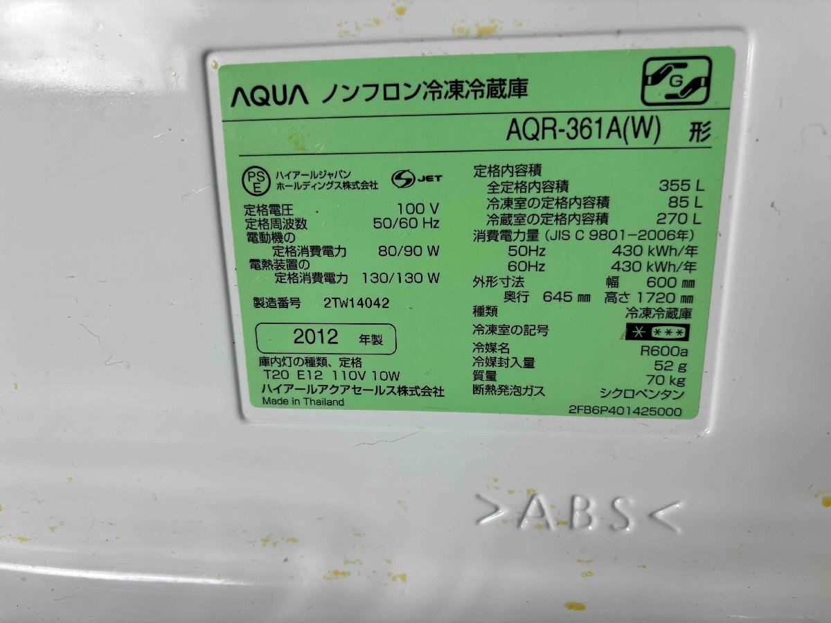 | ご覧頂き誠に有難うございます。 【商品】 ジャンク■アクア冷凍冷蔵庫■2012年製■AQR-361A(W)形■名古屋市発■直接引き取り歓迎♪ 【商品仕様】 型番:AQR-361A(W) ・年式:2012年製 ・外形寸法:幅×奥行×高さ 600×645×1720mm ・定格内容積:355L 冷蔵室:270L 冷凍室:85L ・年間消費電力量:430kwh 【付属品】 ・付属品は説明文に記載または商品写真に写っているもので全てです。 【状態】 通電確認、動作確認済みとなります。 低年式の為、ジャンク品としての出品になります。 ※状態については画像にてご確認下さい。 また、写真に写り切らない傷等もあるかと思いますが、ご了承下さい。 | ||