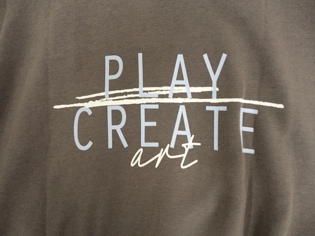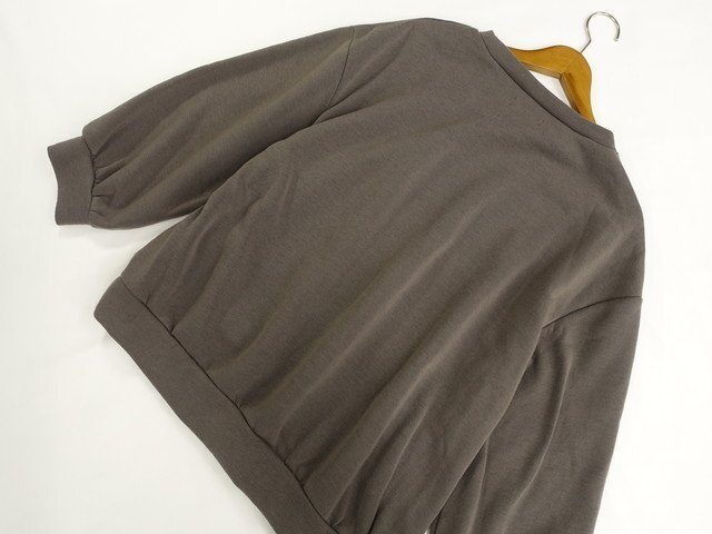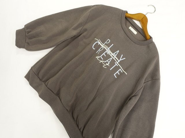 ドロップショルダー 長袖 ラウンドネック トレーナー L グレージュ地 ライトブルー×ホワイト 英字プリント