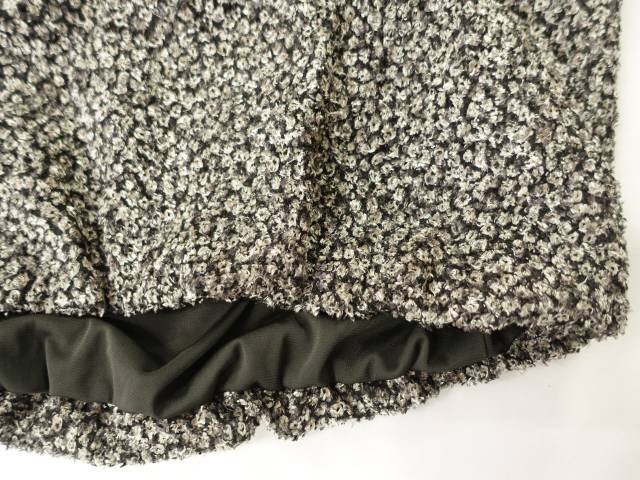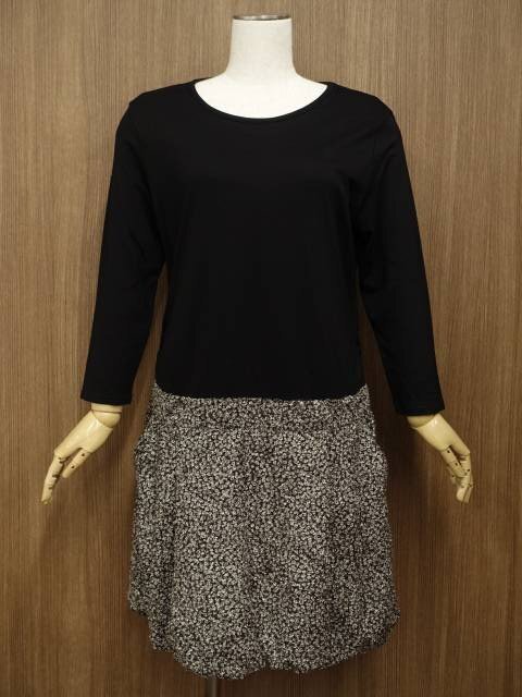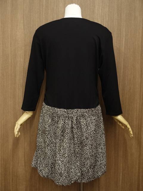 ひざ丈 九分袖 ラウンドネック ドッキングワンピース L ブラック/ブラック×ホワイト MIX