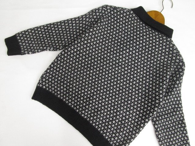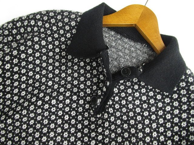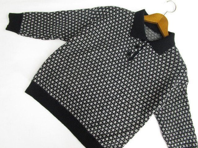 美品 ドロップショルダー 長袖 ポロ衿 ニットセーター ブラック地 ホワイト 総柄