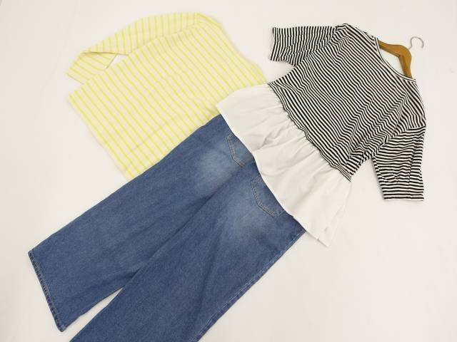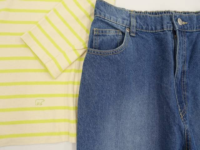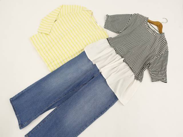洗える5分袖フェイクレイヤードカットソー+長袖カットソー+デニムストレートパンツ コーディネート3点セット LL相当 ホワイト×ブラック ボーダー柄&ホワイト/アイボリー×ネオンイエロー ボーダー柄/ブルー カジュアル・アウトドア系 20代・30代・40代