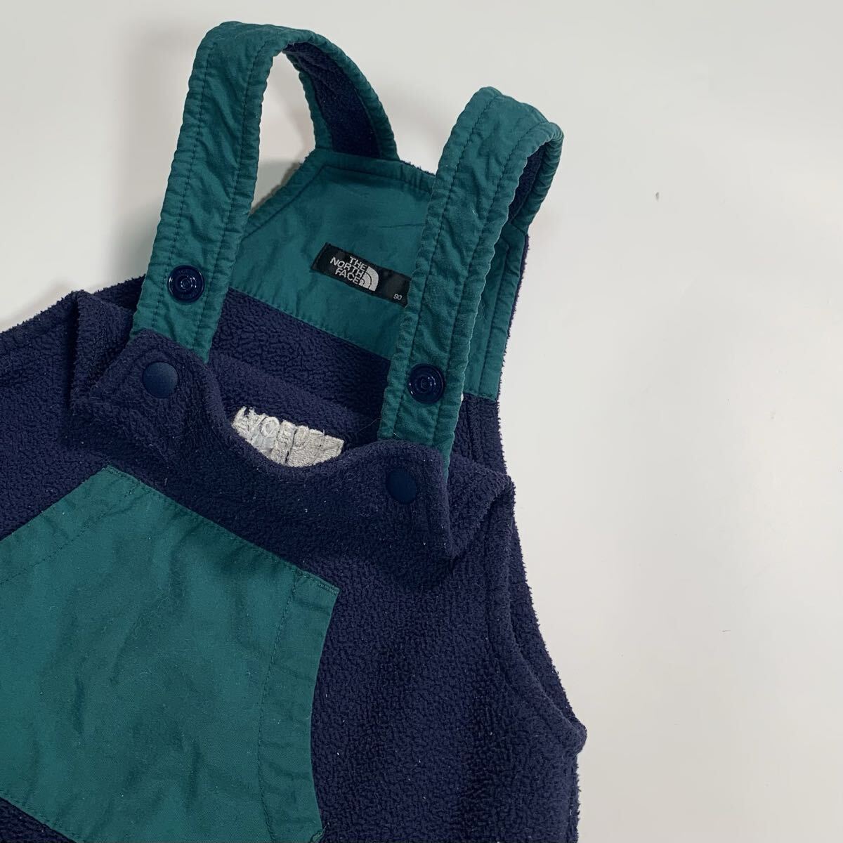 軽くてあたたかいフリース素材のノースフェイスのオーバーオールです。