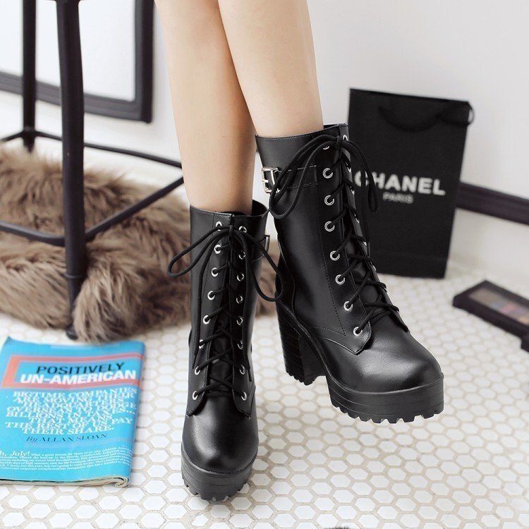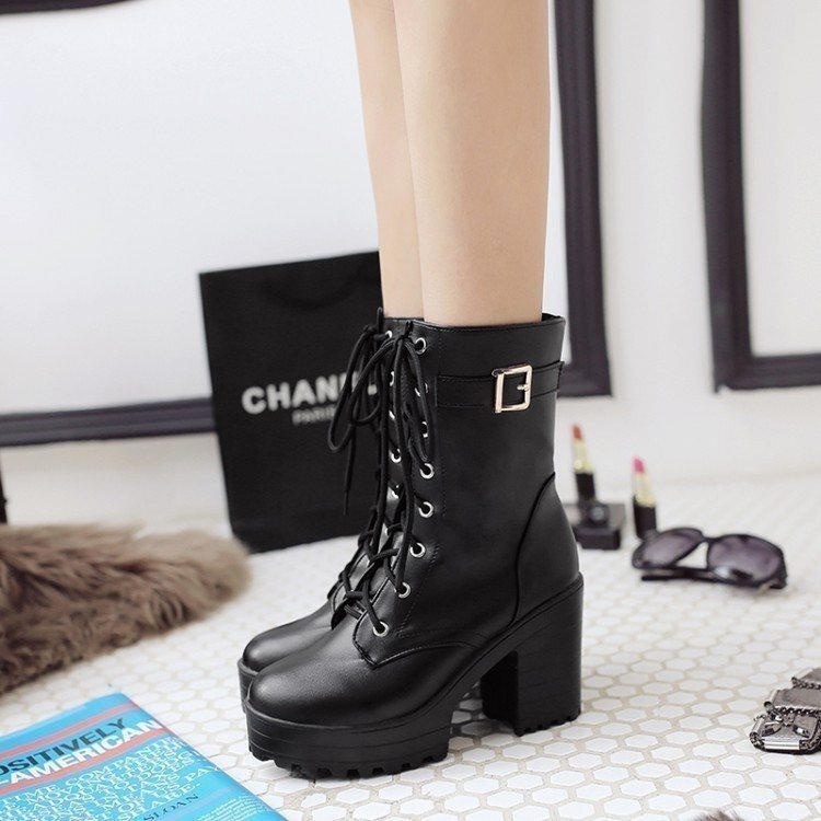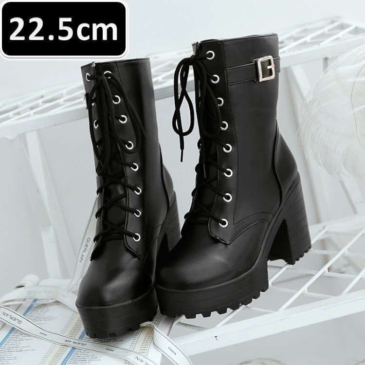 厚底 ショートブーツ ブラック 22.5cm 編み上げ 太ヒール 厚底ソール レースアップ ローヒール カジュアルシューズ コスプレ シンプル