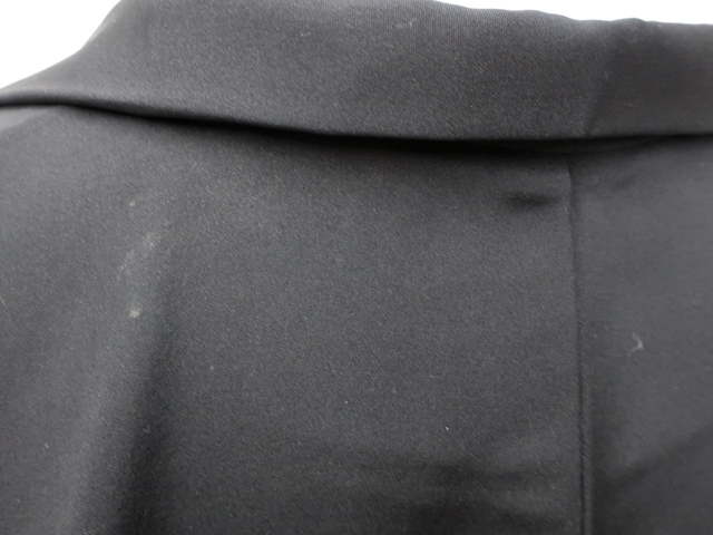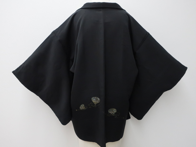 リサイクル商品のため、背に薄汚れ、右後身頃にスレと糸飛び出し、羽織紐にシミがございますが着用可能なお品です。 地色は、黒色です。 1枚目の画像が近いお色かと思われます。 素材は正絹です。 |