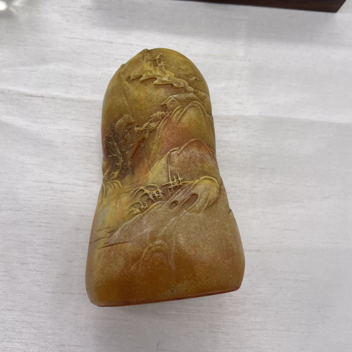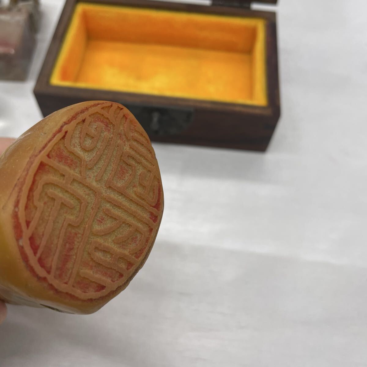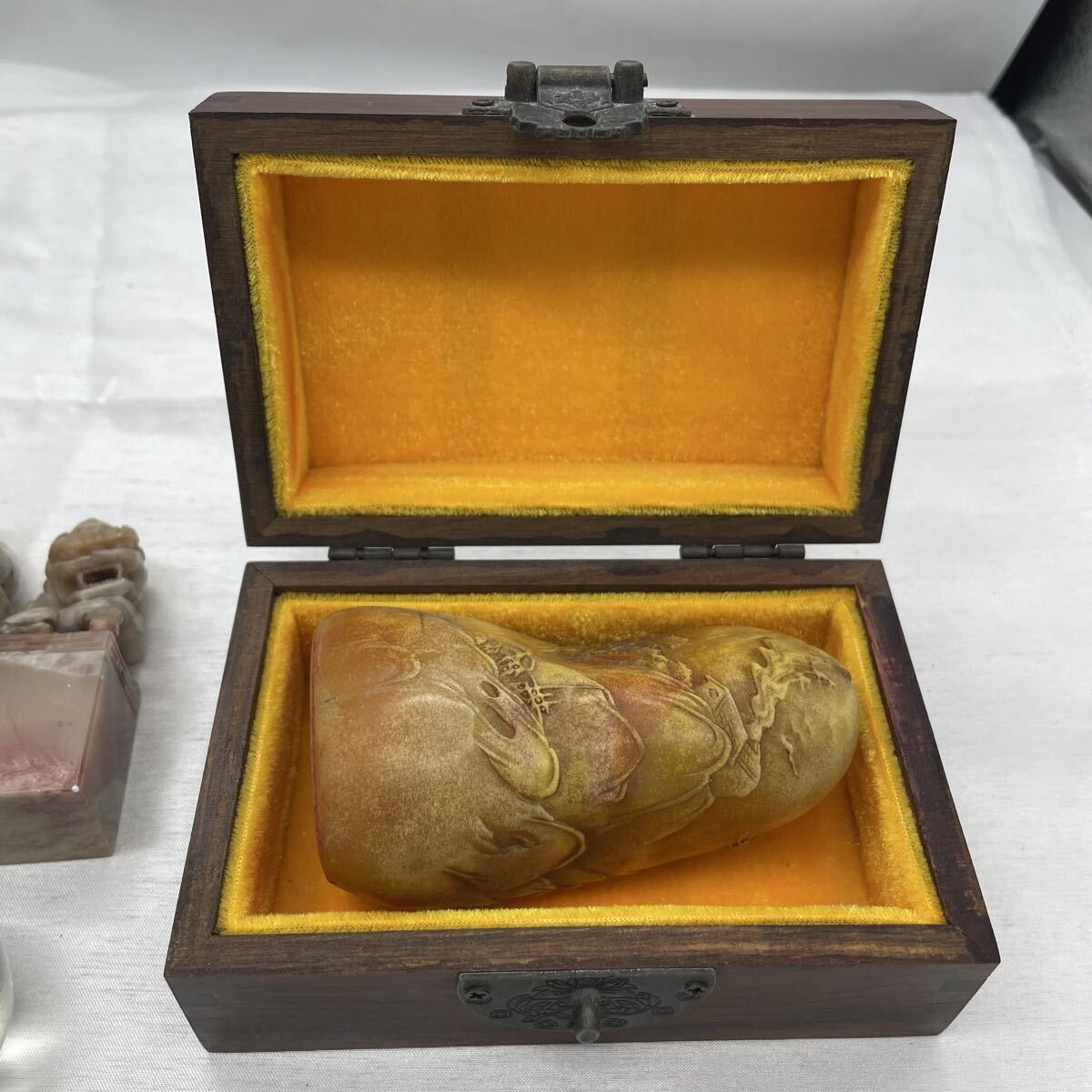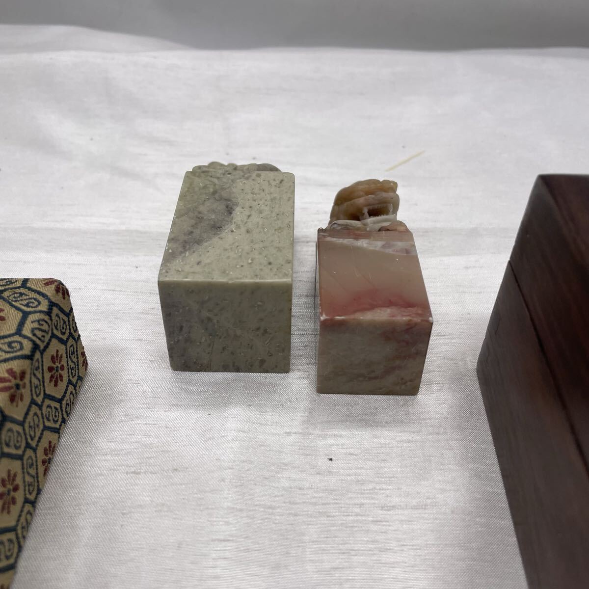 彫刻済みの印章1点と、未使用の印材数点を含む篆刻印材セットです。