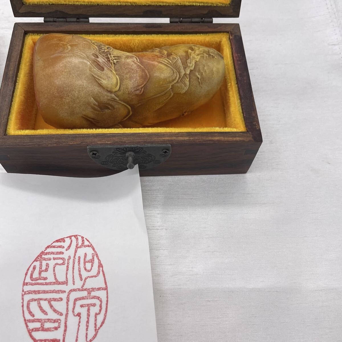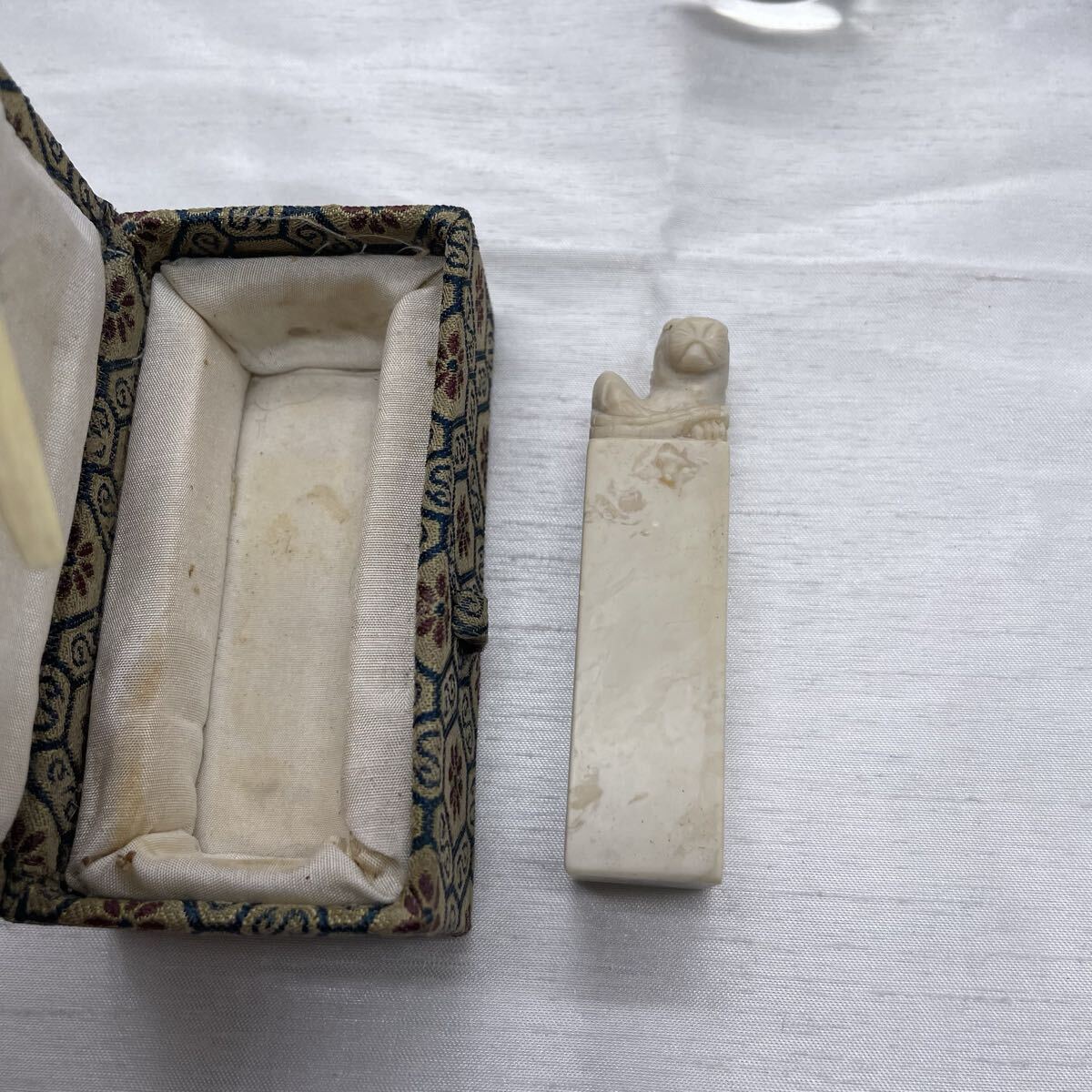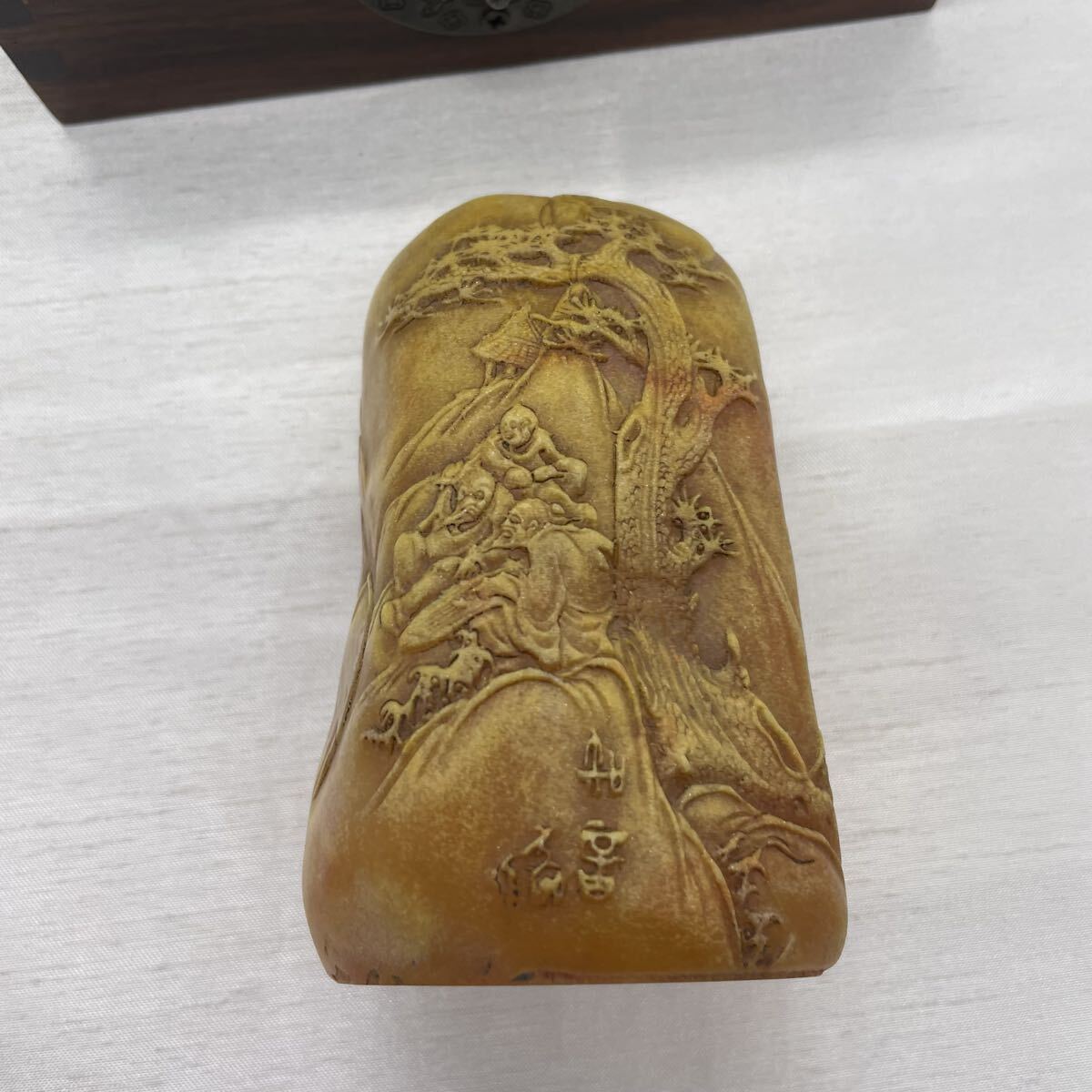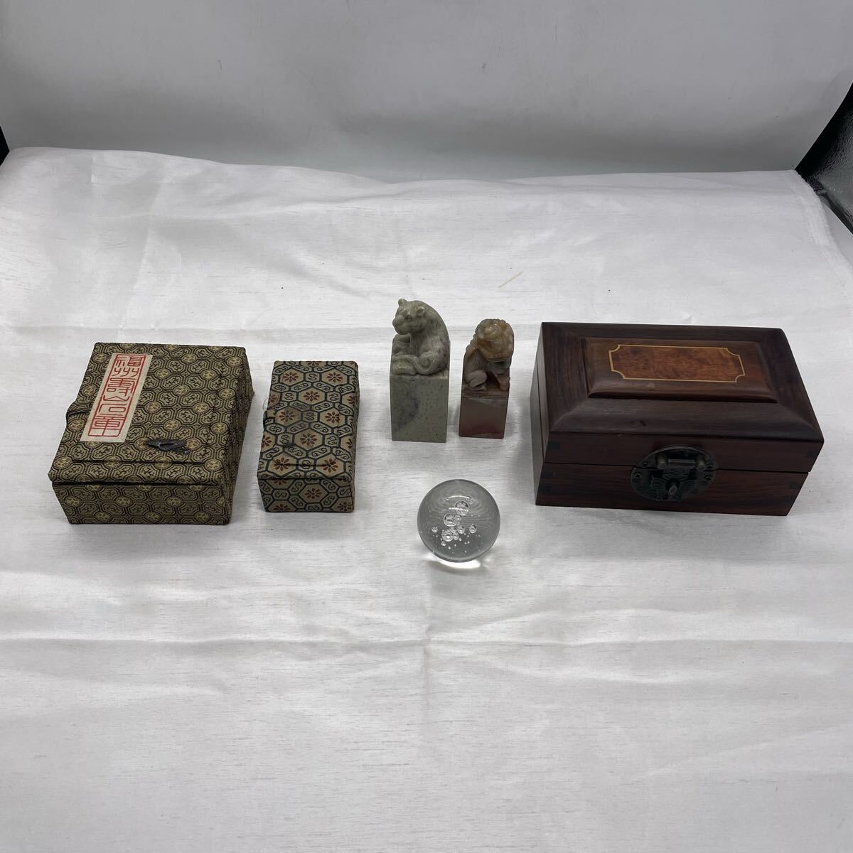 彫刻済みの印章1点と、未使用の印材数点を含む篆刻印材セットです。