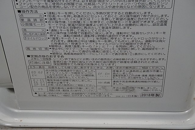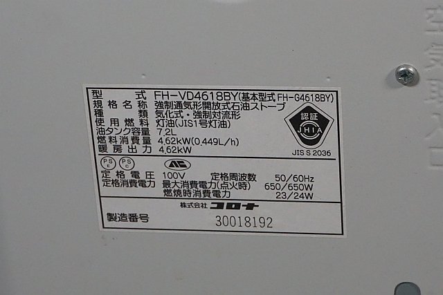 ●◎ ※ジャンク CORONA コロナ 強制通気形開放式石油ストーブ 石油ファンヒーター 7.2Lタンク付 100V 2018年製 FH-VD4618BY 【同梱不可】●