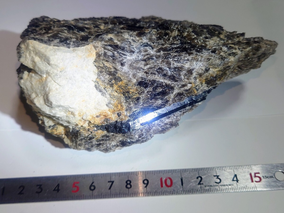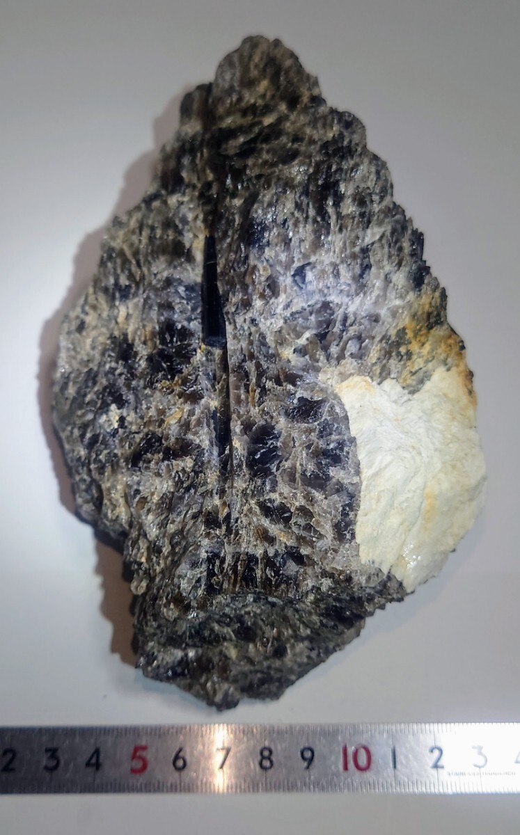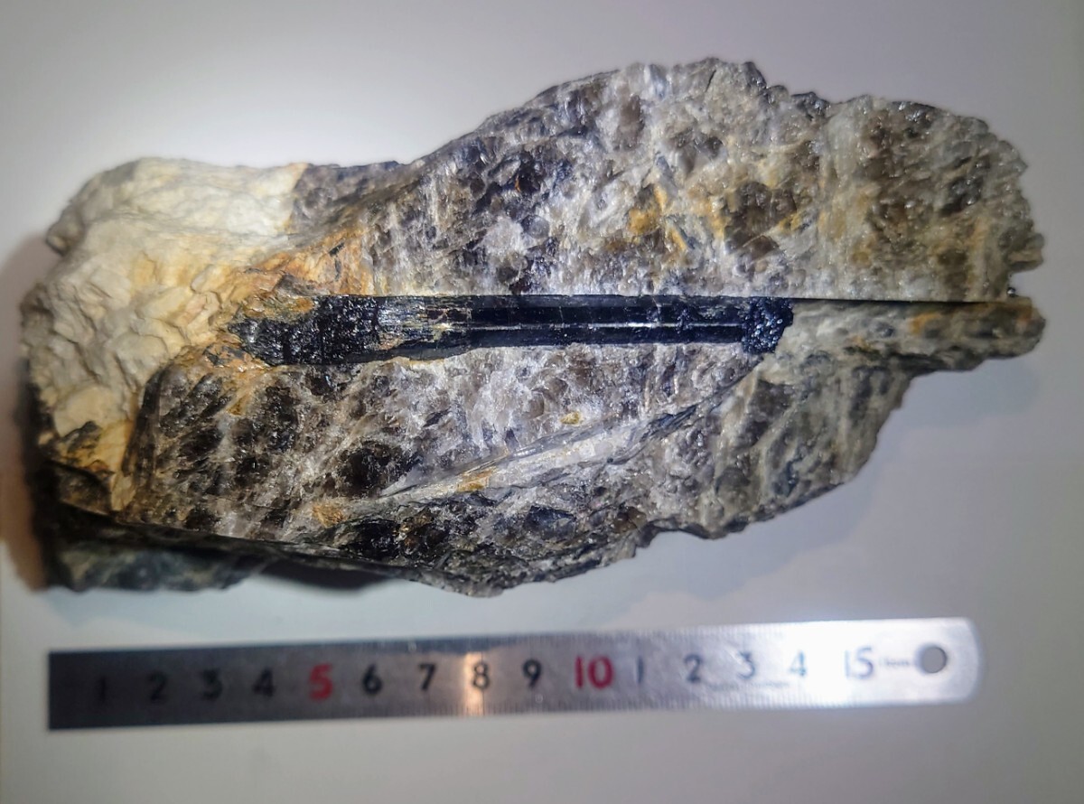 煙石英中に、てりのよい鉄電気石が二本見られます。側にモナズ石褐簾石も付いています。送料600円です。