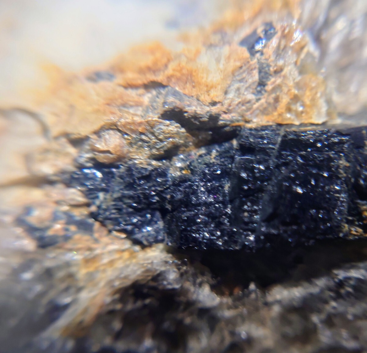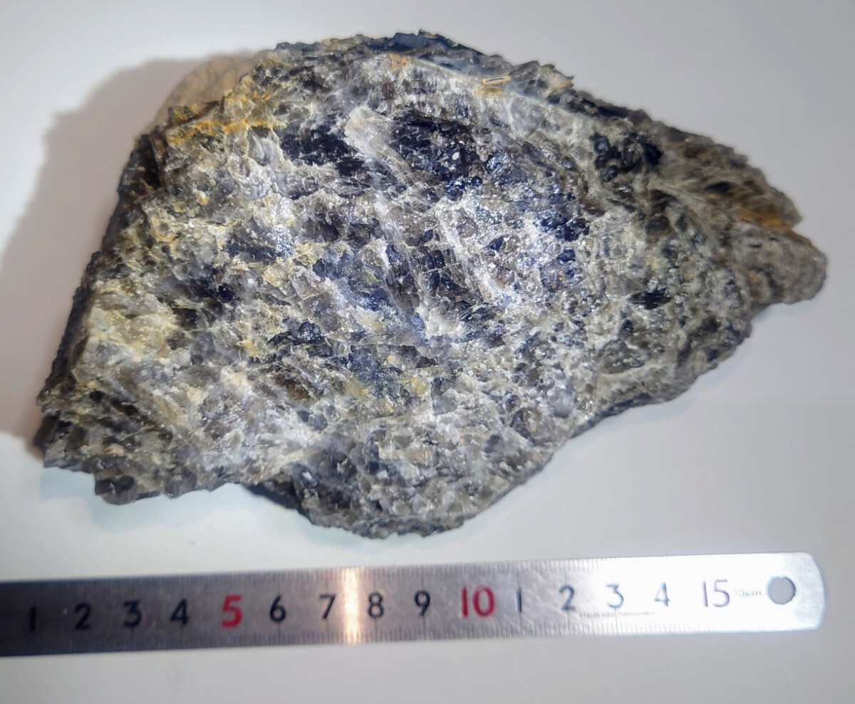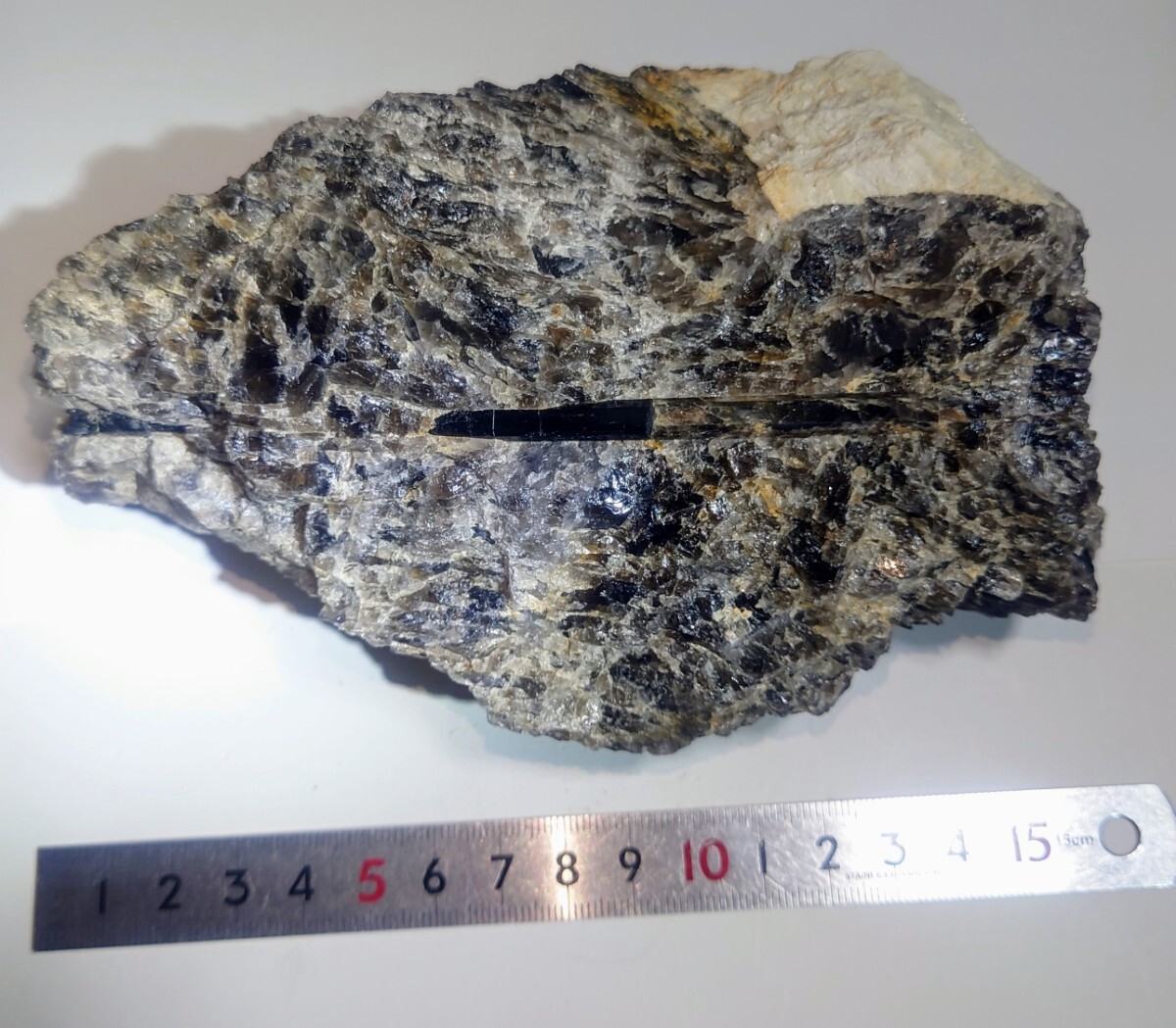 煙石英中に、てりのよい鉄電気石が二本見られます。側にモナズ石褐簾石も付いています。送料600円です。