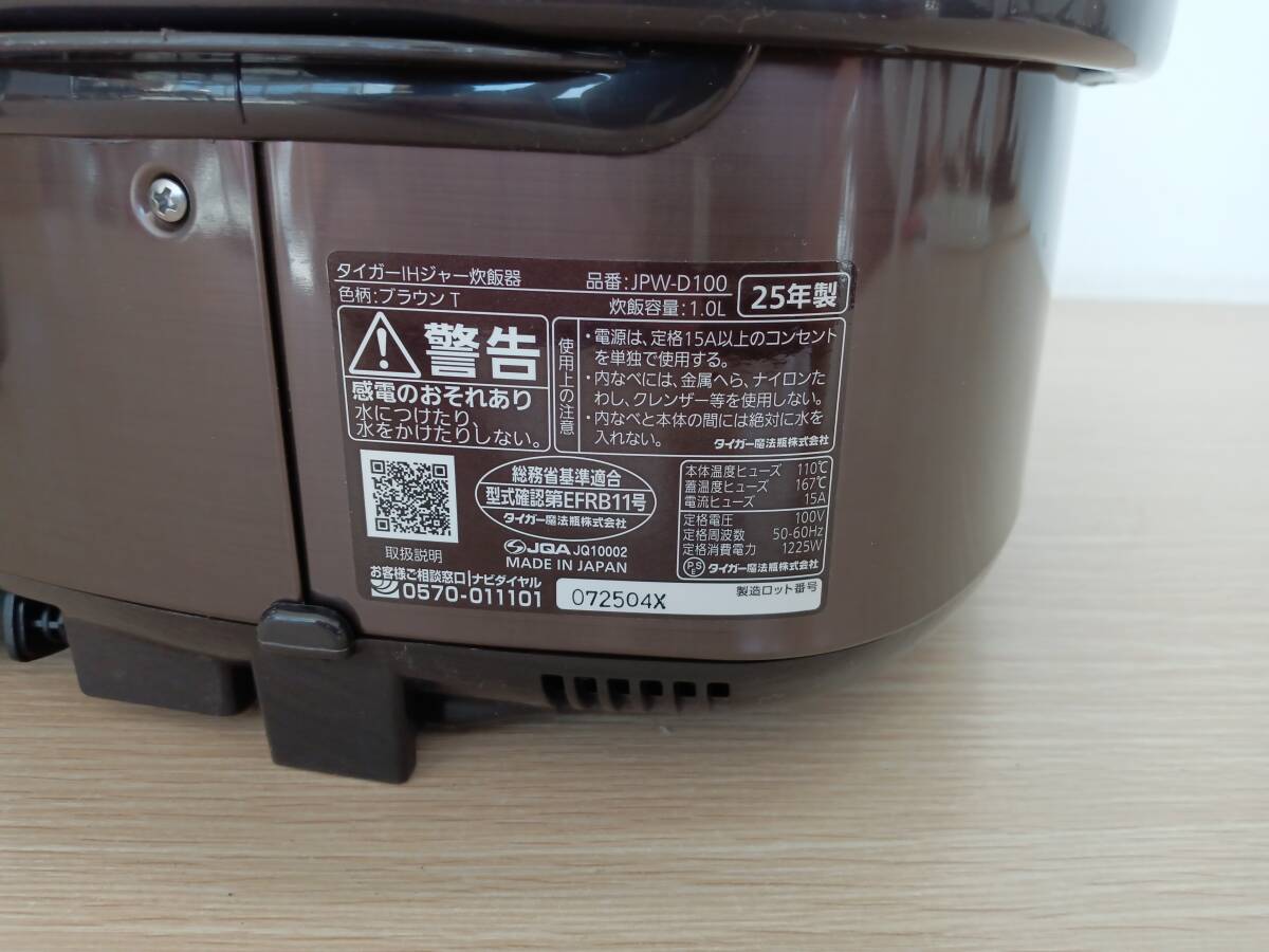 | 【BE-3580】TIGER タイガー JPW-D100 2025年製 IHジャー炊飯器 5.5合炊き 炊きたて 通電確認済 簡易清掃済 | ||