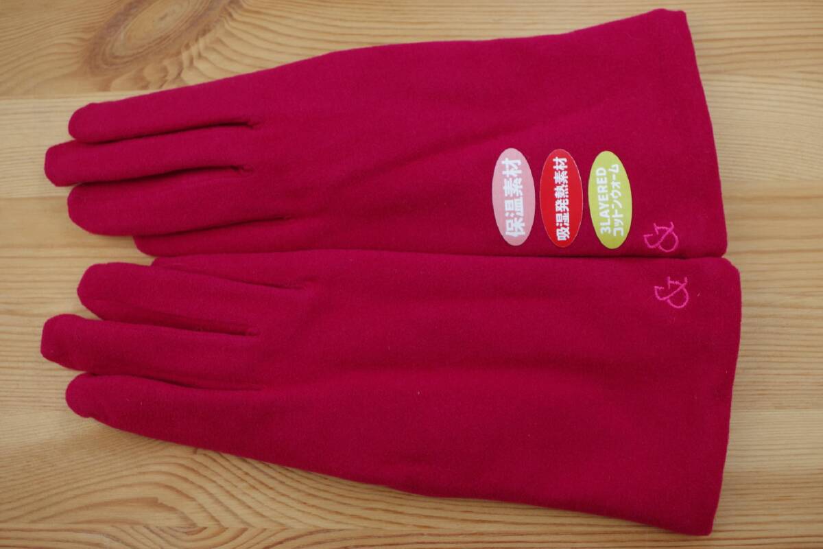 ●ピンキー&ダイアンのあったかい二重手袋、新品です。裏ボアのあたたかな作りです。素材タグがありませんが、保温・吸湿発熱のやわらかな生地です。色は赤。実寸で手首から中指の先まで約25㎝です。正規ライセンス販売品です。