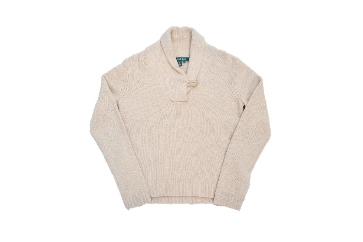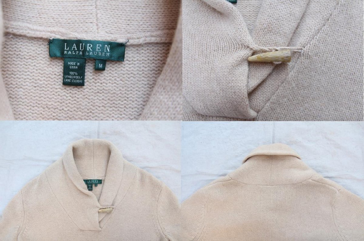 Ralph Lauren製ショールカラーウールセーターになります。目の詰まった肉厚なウール地が暖かく、秋冬らしいショールカラーがキュートなウールセーターです。アームホールは細めですが、肩が落ちるシルエットで多少ゆったり着て頂けるサイズ感になります。生成りの様なクリーム色で何とも女性らしい色味なのも嬉しいポイントかと思います。素材感も相まって柔らかい雰囲気な1枚ですのでより女性らしいフェミニンなスタイリングにバッチリ嵌るかと思います。ブランドネームもばっちりなこちらの1着ですので、お好きな方やお探しだった方は是非この機会にご検討宜しくお願い致します。