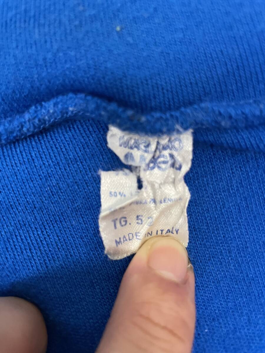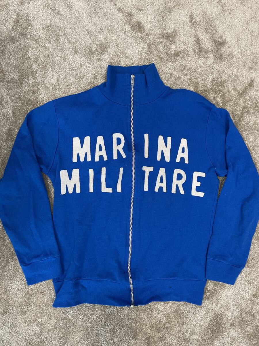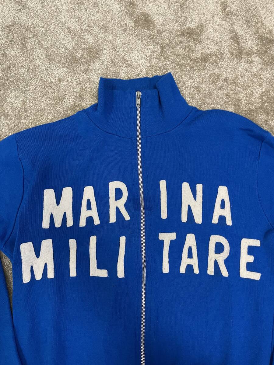 た「MARINA MILITARE」ジップアップスウェットです。 鮮やかなブルーに、立体的な白フェルトロゴがフロントに大胆に配置されたデザイン。 しっかりとした肉厚コットン素材で、ユーロヴィンテージらしい無骨さと品の良さが感じられる一着です。 Made in Italy(イタリア製)で、現在では流通量の少ない希少モデル。 立ち襟タイプのジップアップ仕様で、トラックジャケット感覚でも着られます。 ヴィンテージ品ですので、経年によるスレ、シミ等のコンディションについてご理解の上、購入を検討いただくようお願い致します。 ブランド:MARINA MILITARE(マリーナ・ミリターレ) 生産国:Made in Italy(イタリア製) サイズ表記:TG.52(タグ表記サイズ) 実寸 :肩幅48、着丈55、身幅51、袖丈53 素材:コットン50%、アクリル50% カラー:ロイヤルブルー × ホワイトロゴ 状態:経年の使用感あり(小さなスレ・ヨレ程度)、大きな汚れや破れなし