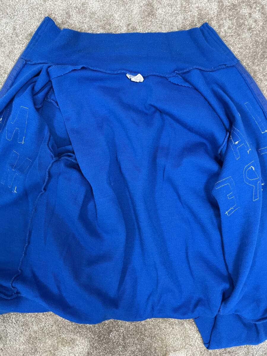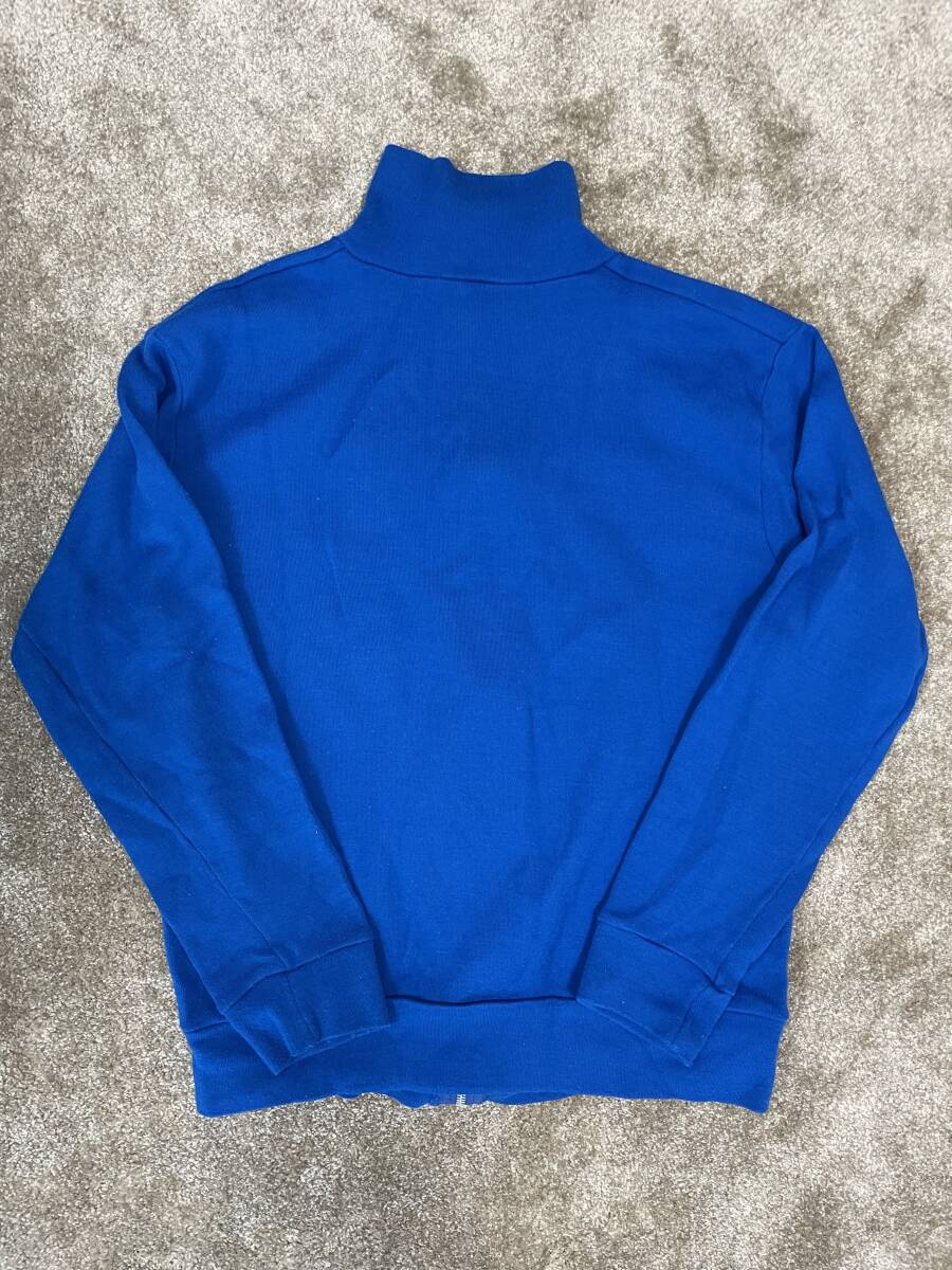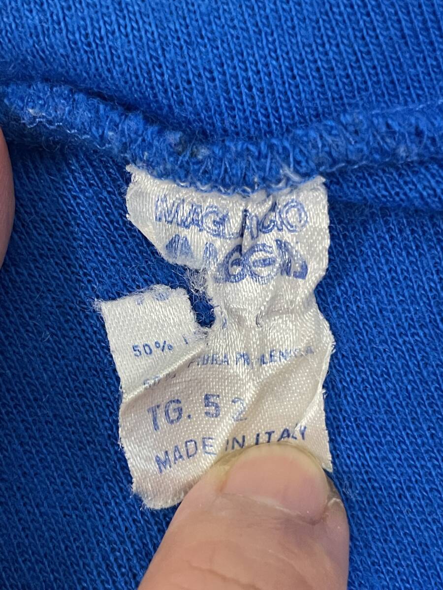 た「MARINA MILITARE」ジップアップスウェットです。 鮮やかなブルーに、立体的な白フェルトロゴがフロントに大胆に配置されたデザイン。 しっかりとした肉厚コットン素材で、ユーロヴィンテージらしい無骨さと品の良さが感じられる一着です。 Made in Italy(イタリア製)で、現在では流通量の少ない希少モデル。 立ち襟タイプのジップアップ仕様で、トラックジャケット感覚でも着られます。 ヴィンテージ品ですので、経年によるスレ、シミ等のコンディションについてご理解の上、購入を検討いただくようお願い致します。 ブランド:MARINA MILITARE(マリーナ・ミリターレ) 生産国:Made in Italy(イタリア製) サイズ表記:TG.52(タグ表記サイズ) 実寸 :肩幅48、着丈55、身幅51、袖丈53 素材:コットン50%、アクリル50% カラー:ロイヤルブルー × ホワイトロゴ 状態:経年の使用感あり(小さなスレ・ヨレ程度)、大きな汚れや破れなし