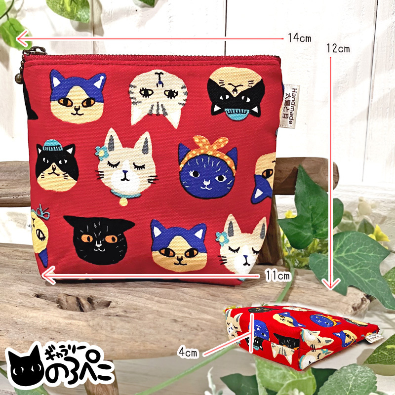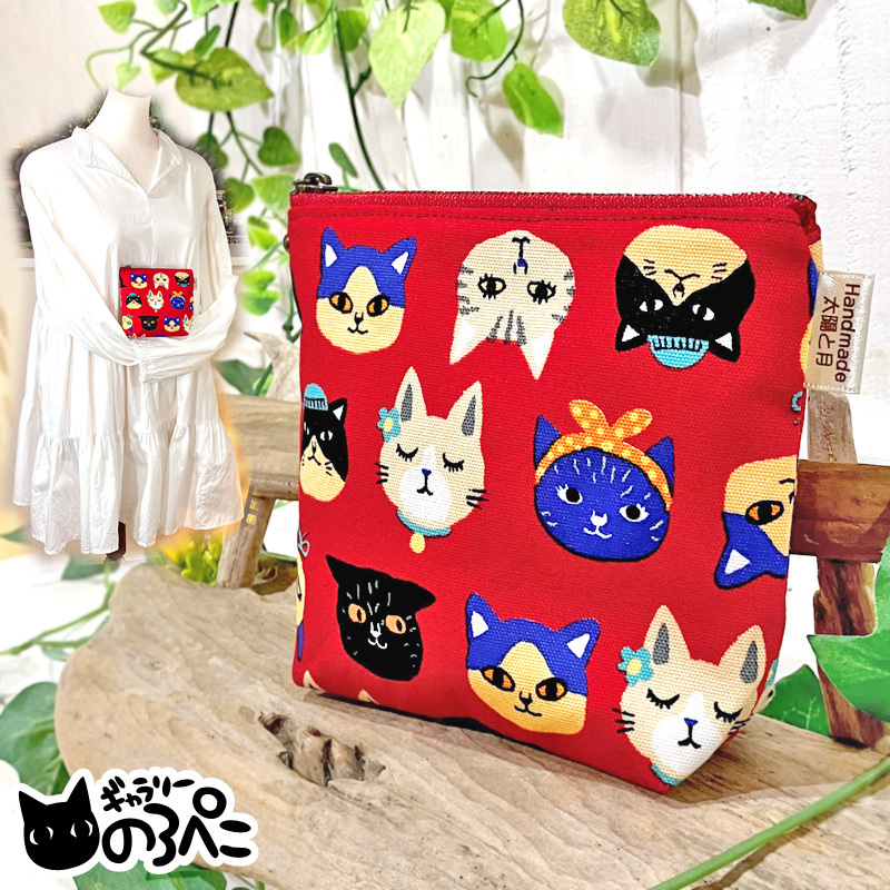 猫ちゃんのお顔が並んだファスナーポーチ(猫柄コットンの深型ポーチ・レッド) bc862-26