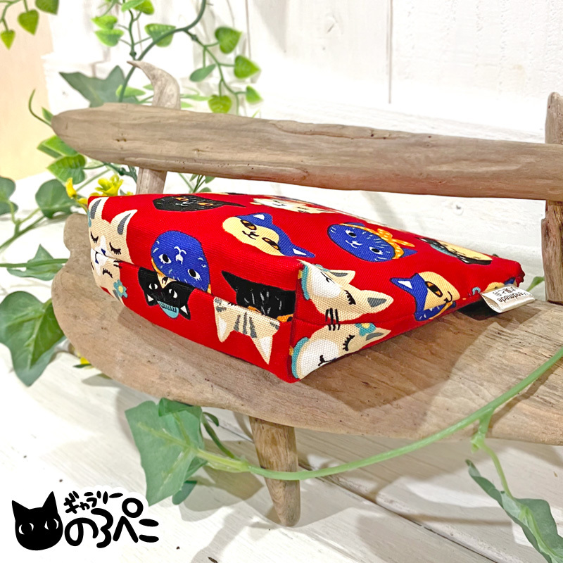 外側は発色のいいレッドの猫柄コットン生地。適度な厚みの丈夫な生地で、接着芯も使ってあるので、張りがあってヘナヘナ型崩れなどせず、自立するくらいしっかりしていて、中にアレコレ入れるのにも安心感があります。