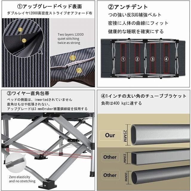 サイズ:掲載写真をご参照ください。 丈夫な鋼管のフレームと継手は数秒以内に折りたたみます。 コンパクトで家、プール、湖、車、キャンプ場、テントや小屋など様々なシーンに活躍です。 丈夫な鋼管のフレームと1200 Dオックスフォードを使って作っています。最大耐荷重が200 KGで、安定性が抜群です。もっと長く持ちます。 枕元の傾斜角度を折りたたみ、背中や首や肩の痛みがなくなるように設計します。 凹凸補強:4つの強力な抗凹補強帯をアップグレードし、人体の曲線にぴったりとフィットし、睡眠がより快適です。