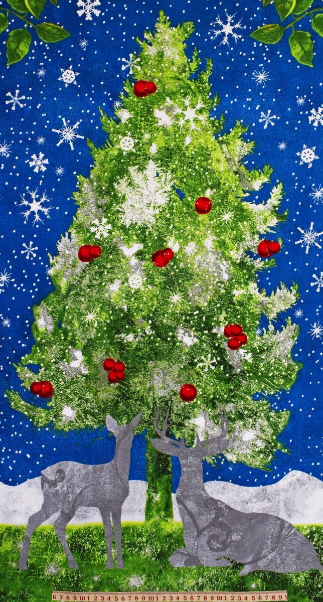 根本に鹿の親子が佇み、雪が降ってくる中のクリスマス・ツリー。