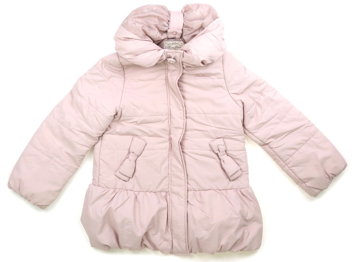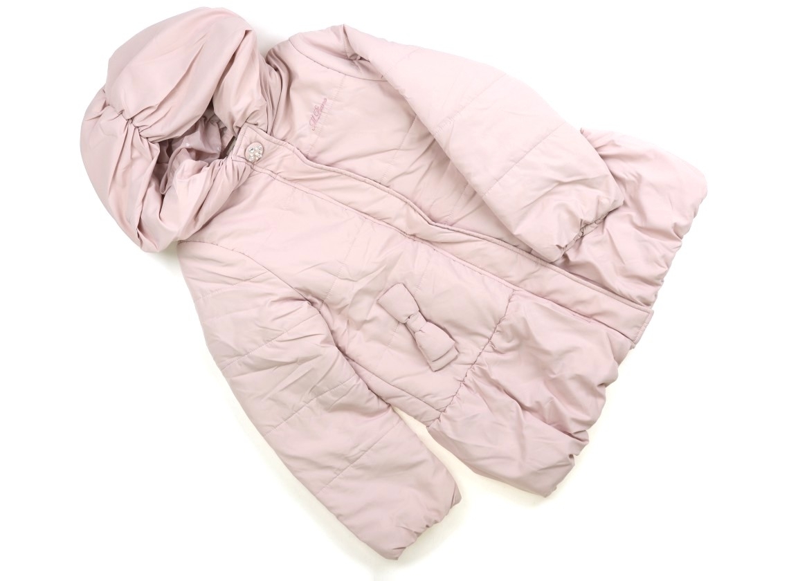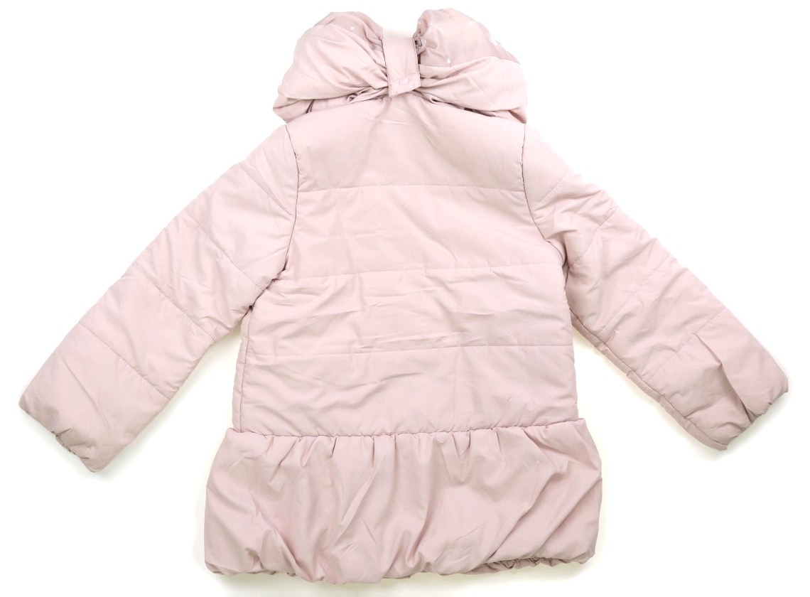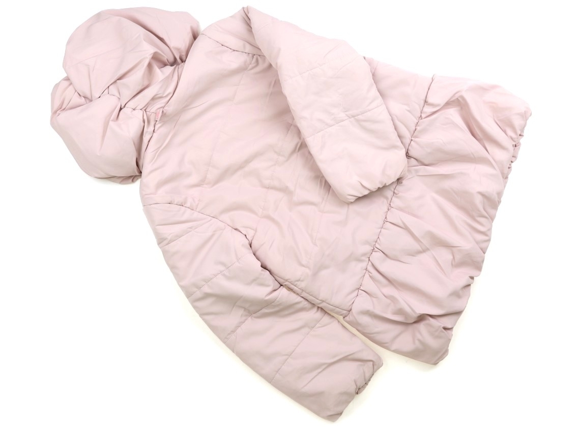 表地・裏地・中綿すべてポリエステル素材です。フードは縫い付けで、タブで留められます。左ポケットのリボンの中心がほつれています。袖口に薄汚れ、小さなシミがります。裾部分の中綿のよれが目立ちますが、まだお使いいただけそうです。