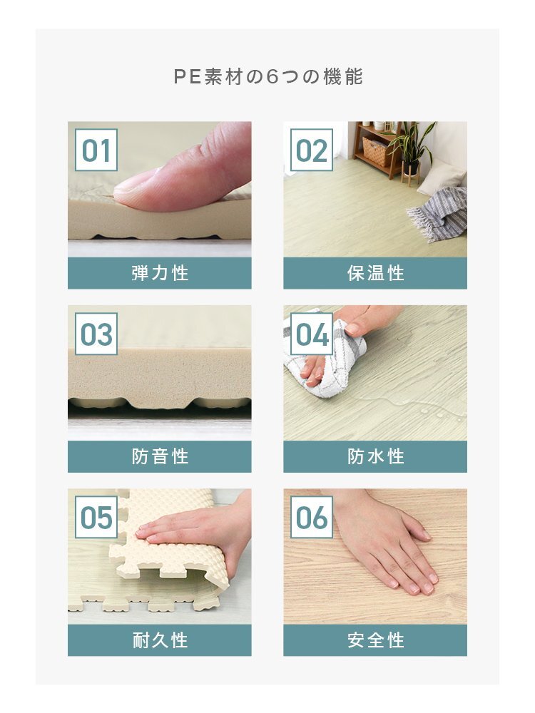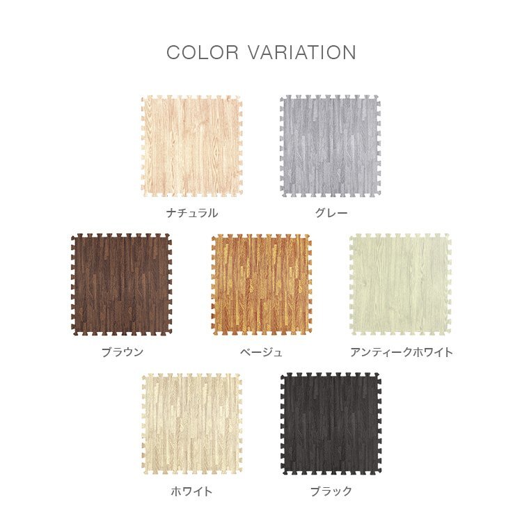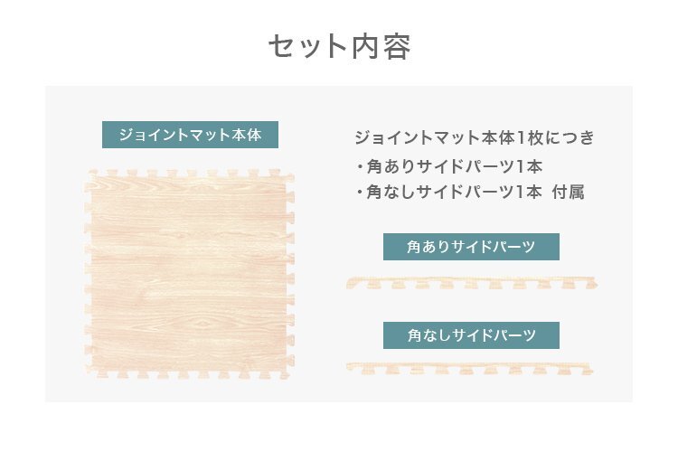 パパもママも安心! 60cm 大判 ジョイントマットです。 大判サイズだから、敷く枚数も少なく、設置もラクラク! カッターやはさみで簡単に切れるのでレイアウト自由自在! 足音をやわらげてくれるので、子供部屋やフローリングのお部屋に最適です! 適度なクッション性が転倒時に衝撃を和らげてくれます! 冬は床下からの冷気をカット! 夏は冷房による温度を効率よく保ちます。 汚れた部分は取り外して水洗いが出来てカンタンお手入れ♪ 嬉しい!サイドパーツ付き! 壁ぎわに敷いても、隙間なくキレイに。 掃除がラクラク!! 自然をイメージした木目デザイン! お部屋に落ち着いた雰囲気を与えてくれます! |