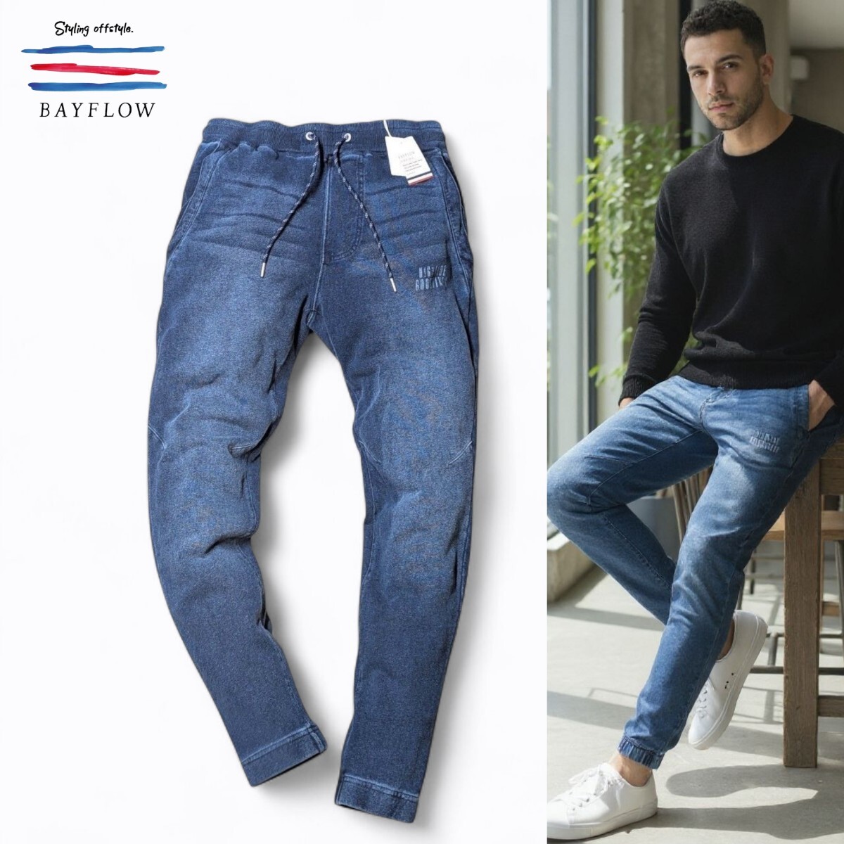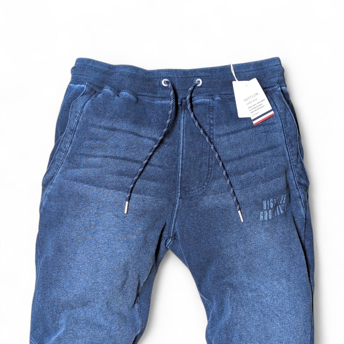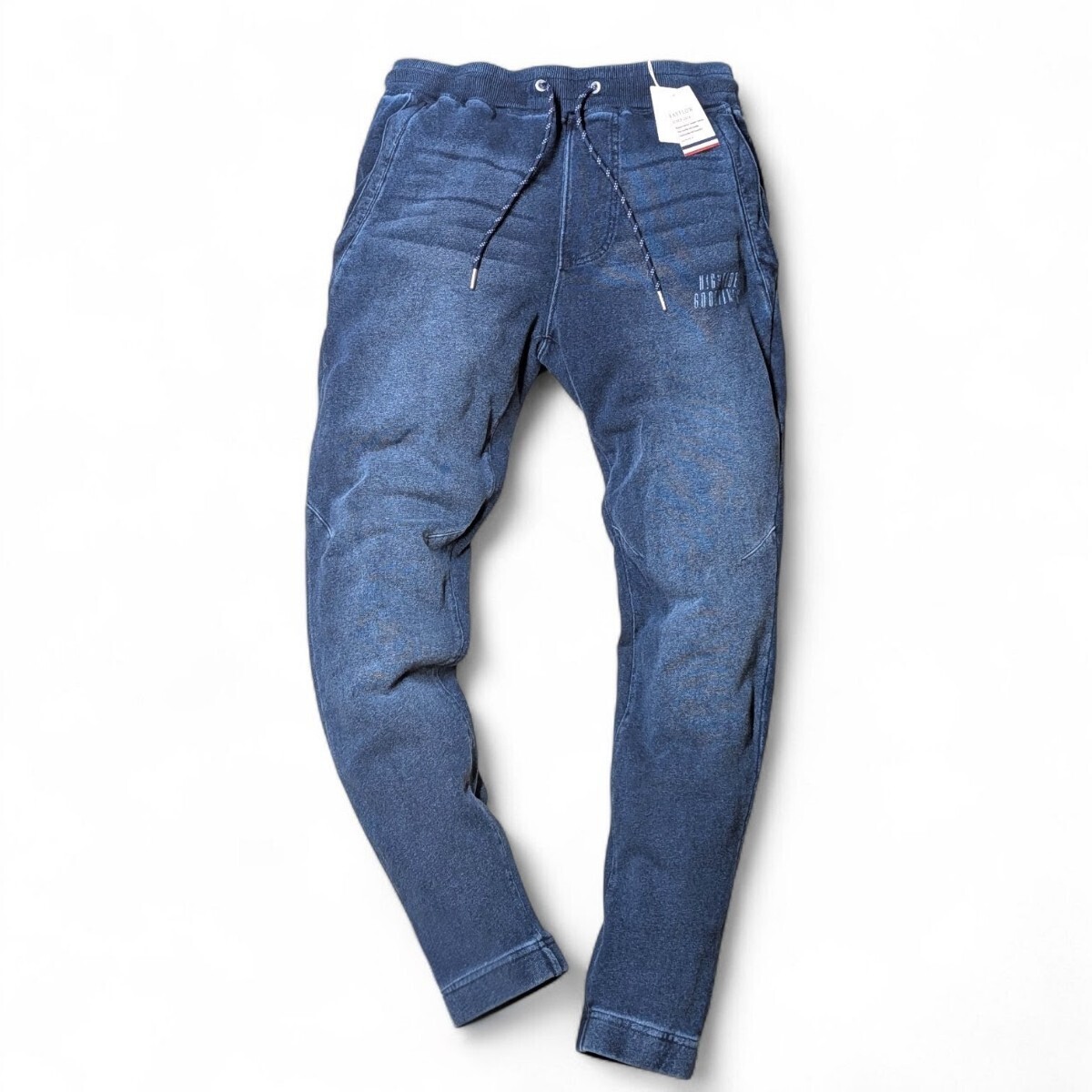 ウエストはゴム紐のイージー仕様。裾はジョグデザインで、左ももに雰囲気あるプリント入りです。オールシーズン着用可能。