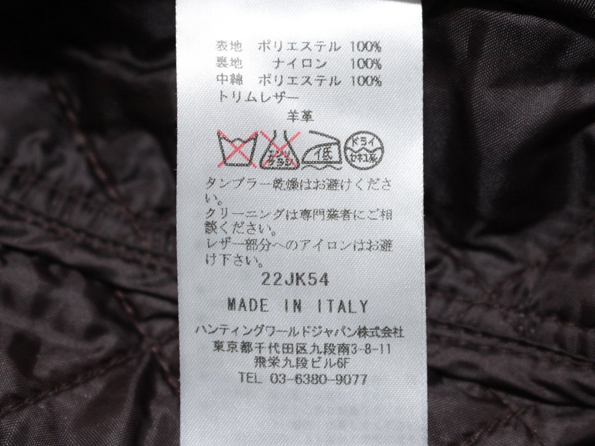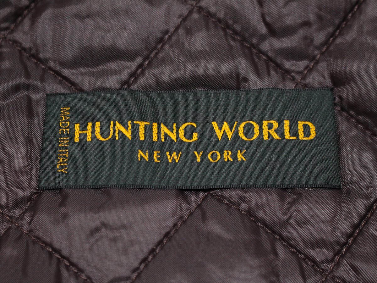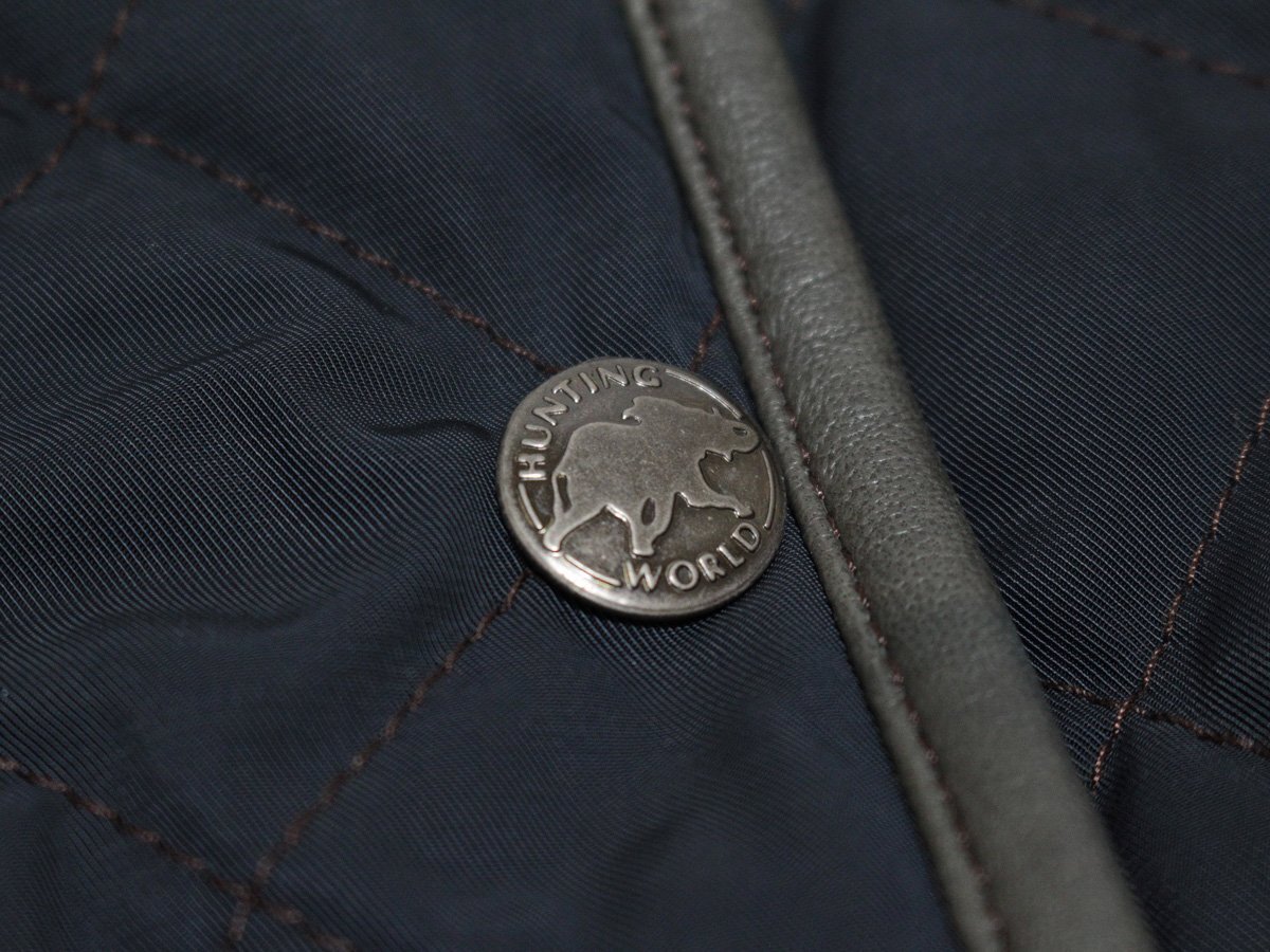 イタリア製 HUNTING WORLD ハンティングワールド 中綿入り キルティングジャケットです。素材は表地:ポリエステル100%、裏地:ナイロン100%、中綿:ポリエステル100%、トリムレザー:牛革になります。
