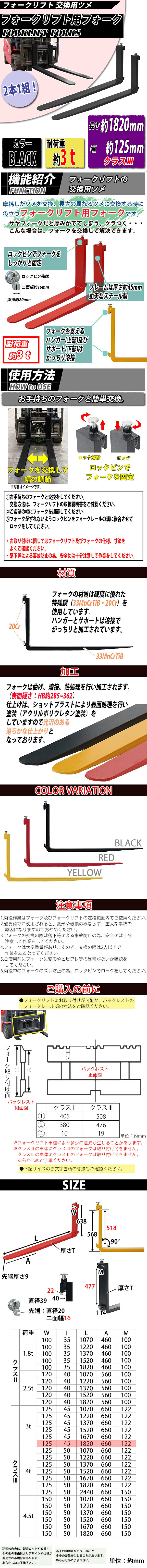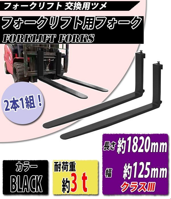 | 商品名 | 送料無料 フォーク 爪 2本セット 黒 長さ約1820mm 幅約125mm 耐荷重約3t 厚さ約45mm フォークリフト用 交換用 フォーク ツメ 耐荷重約3000Kg フォークリフト アタッチメント 運搬 荷役 交換 クラス3 ブラック fork125451820 |