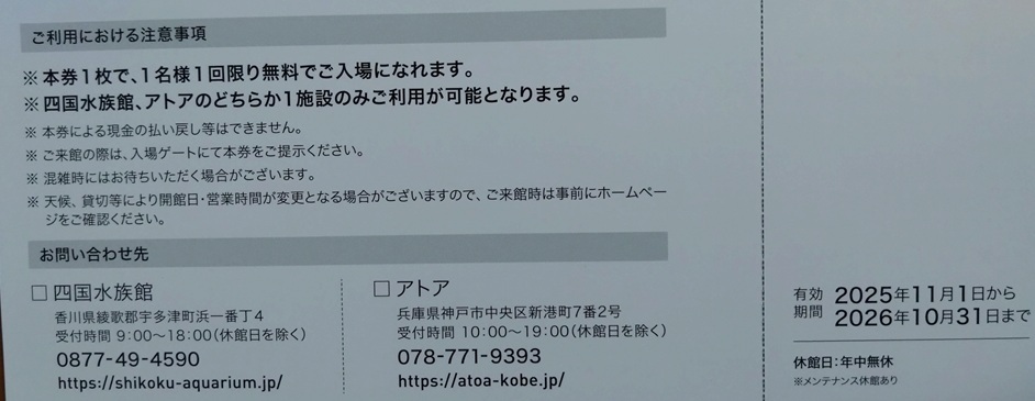 四国水族館かアトアのいずれか1施設のみ利用できます。