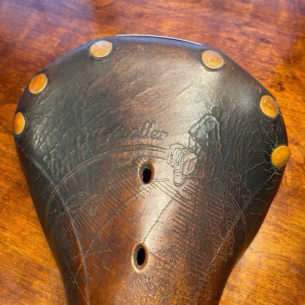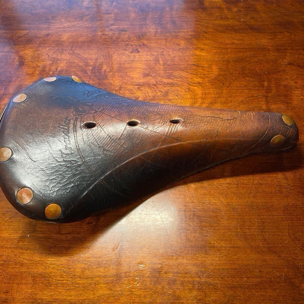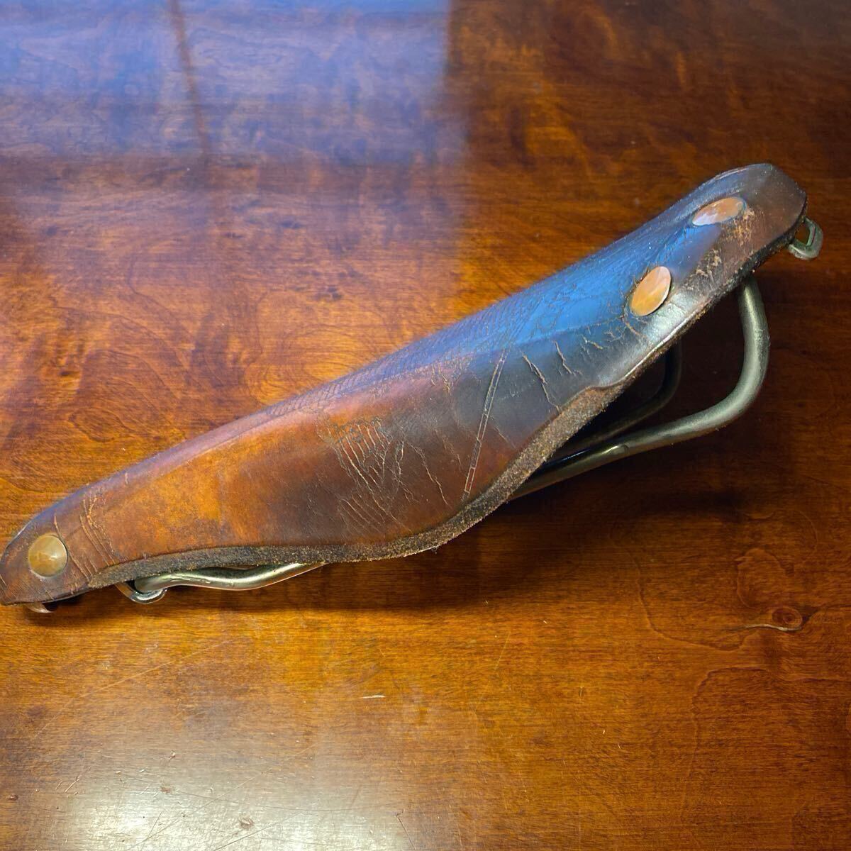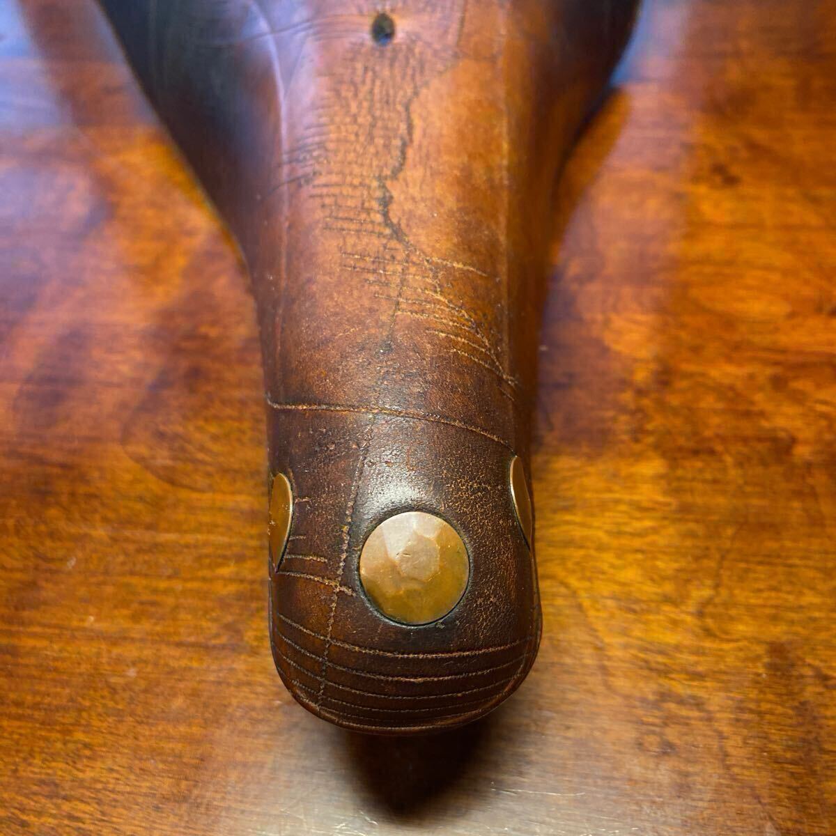 13年ほど前に、あるショップにディスプレイしてあったものをお願いして譲っていただきました。定期的に専用オイルを塗って磨き、雨に当たらないように気をつけながら使用していました。5年半前にイデアル92を購入したのを機に現役を引退させ、屋内で保管していました。調整ネジにも余裕がありますので、まだまだ使用できます。ブルックスの世界観を伝えるチラシが付属しているのも劇レアです。