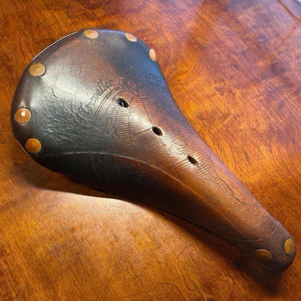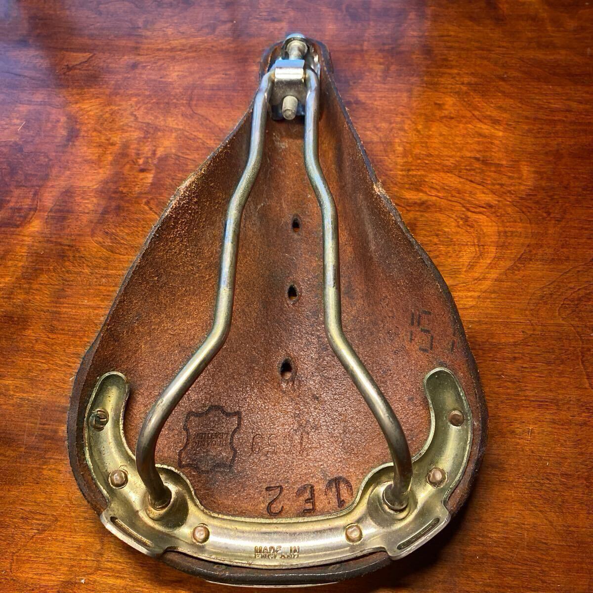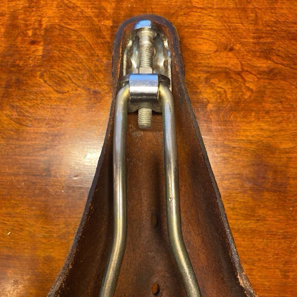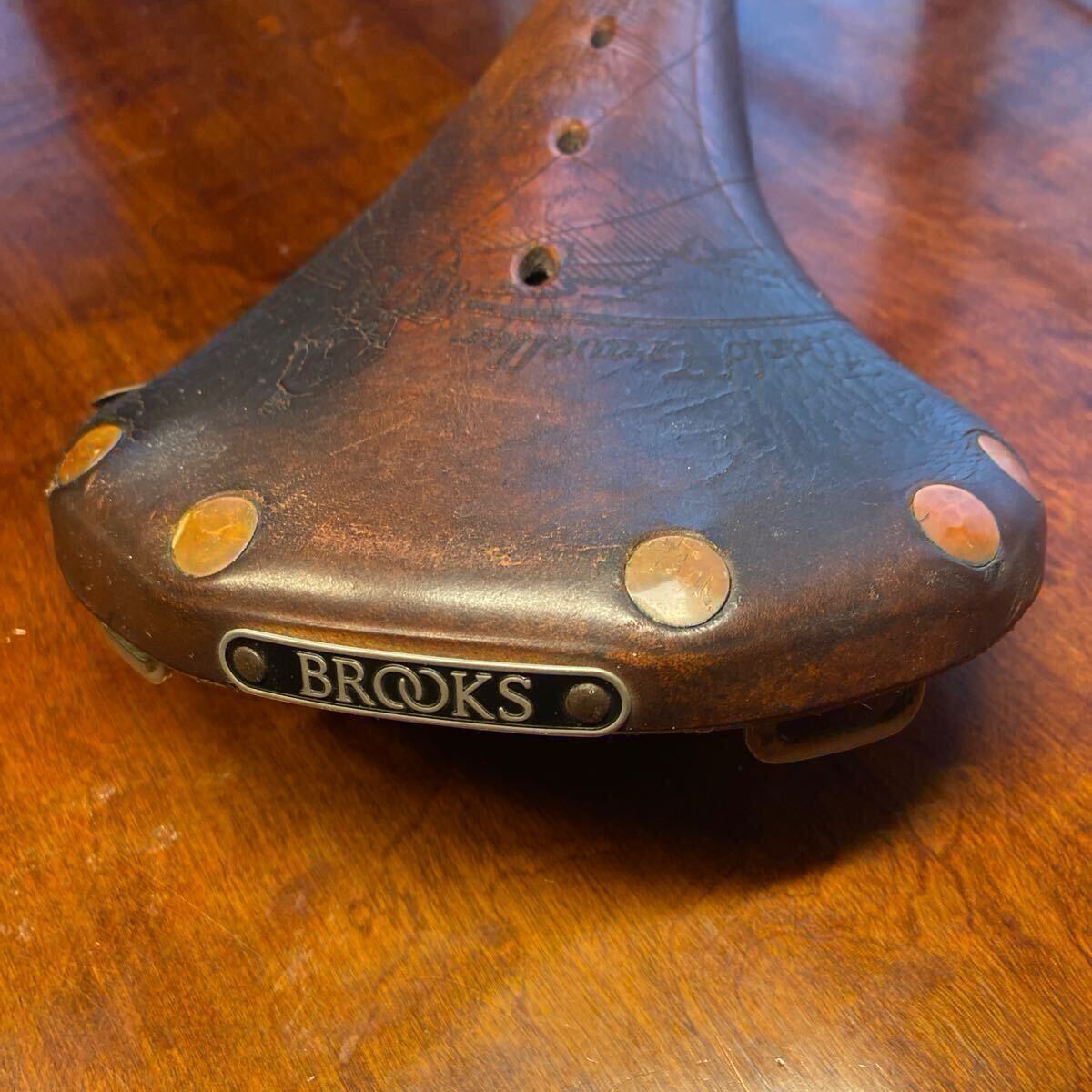 13年ほど前に、あるショップにディスプレイしてあったものをお願いして譲っていただきました。定期的に専用オイルを塗って磨き、雨に当たらないように気をつけながら使用していました。5年半前にイデアル92を購入したのを機に現役を引退させ、屋内で保管していました。調整ネジにも余裕がありますので、まだまだ使用できます。ブルックスの世界観を伝えるチラシが付属しているのも劇レアです。