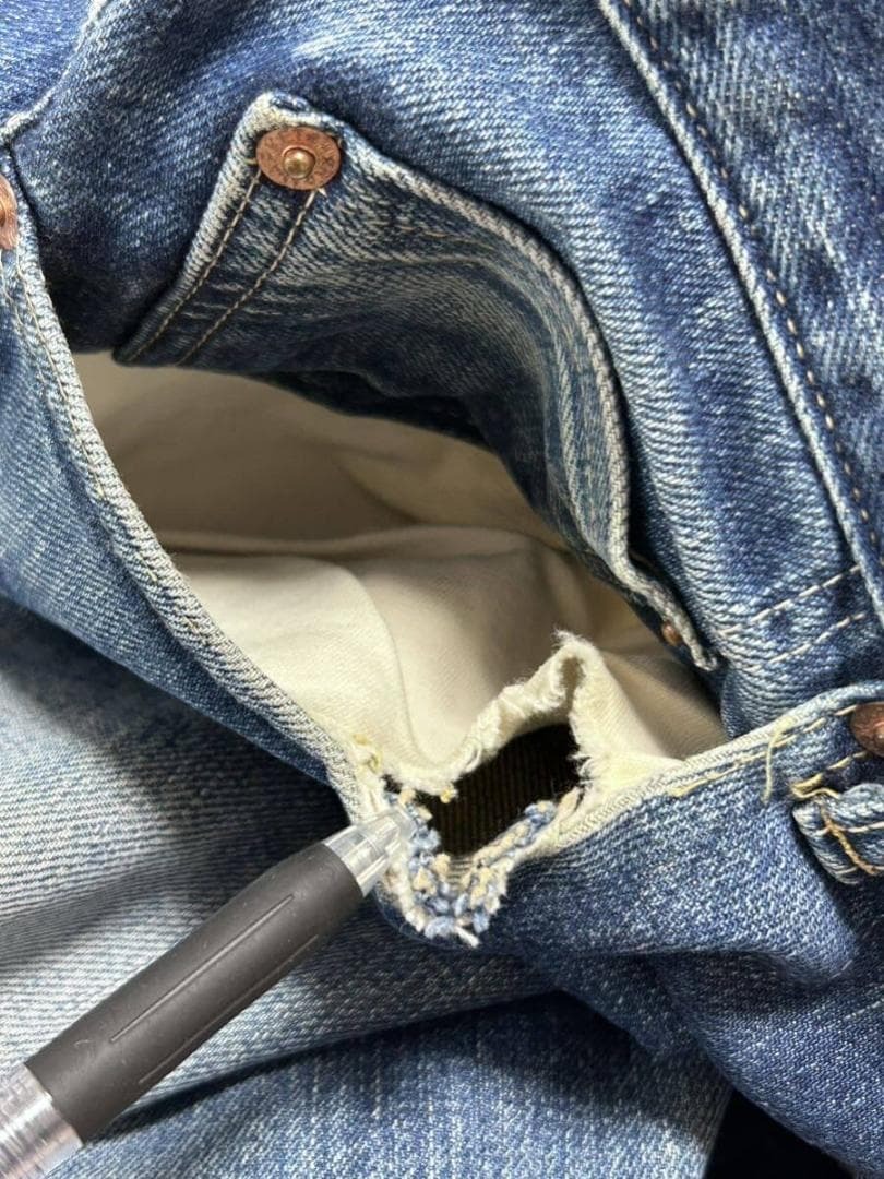 ・裾、両裾上、バックポケット、ヒップにダメージが見られます。